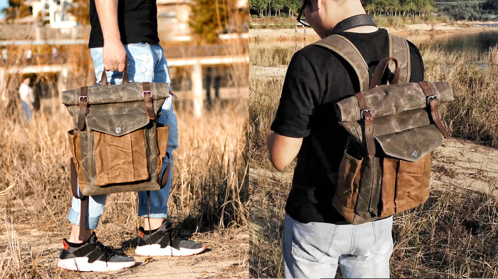 - This sleek yet simple waxed canvas backpack has caught the attention of many. It's practical in many ways as it functions both as a handbag and a backpack. It is also decorated with a rolltop which makes it different from the others. It can hold a laptop and loads of essential things that you might want to bring anywhere you go. It also has extra sleeves for other smaller stuff like a wallet, a pocketbook, a phone and many more!