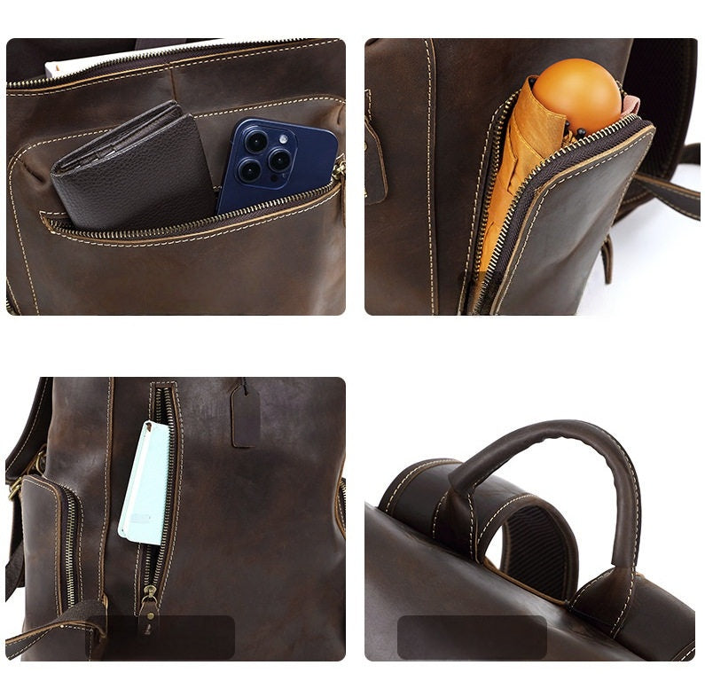 Introducing the ultimate blend of rugged style and practical organization: the Leather Backpack for 15 inch Laptop. Expertly crafted from premium full-grain crazy horse leather in a rich, deep coffee brown, this spacious and stylish Leather 15 inch Laptop Backpack is designed for the modern professional who values both form and function. Measuring 40cm x 32cm x 11cm and weighing just 1.5kg, it offers ample storage without unnecessary bulk, making it the perfect companion for your daily commute, workday, or business travel.