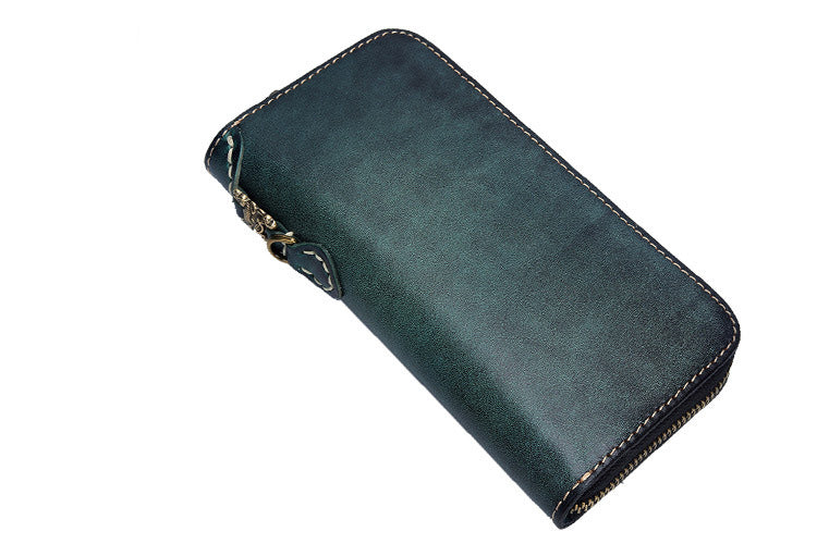 Around Zip Green Leather Biker Wallet Mens Minimalist Zipper Clutch Wallet for Men