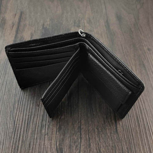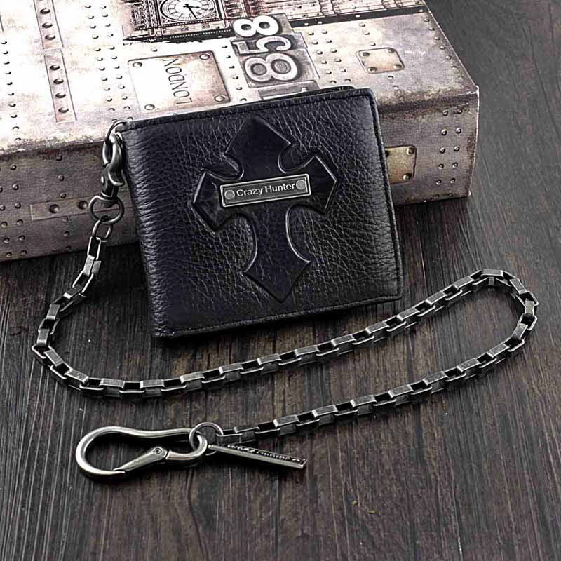 Style: Badass Black Leather Men's Bifold Carved Cross Small Biker Wallet Chain Wallet Wallet with chain For Men
