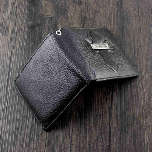Design: Badass Black Leather Men's Bifold Carved Cross Small Biker Wallet Chain Wallet Wallet with chain For Men
