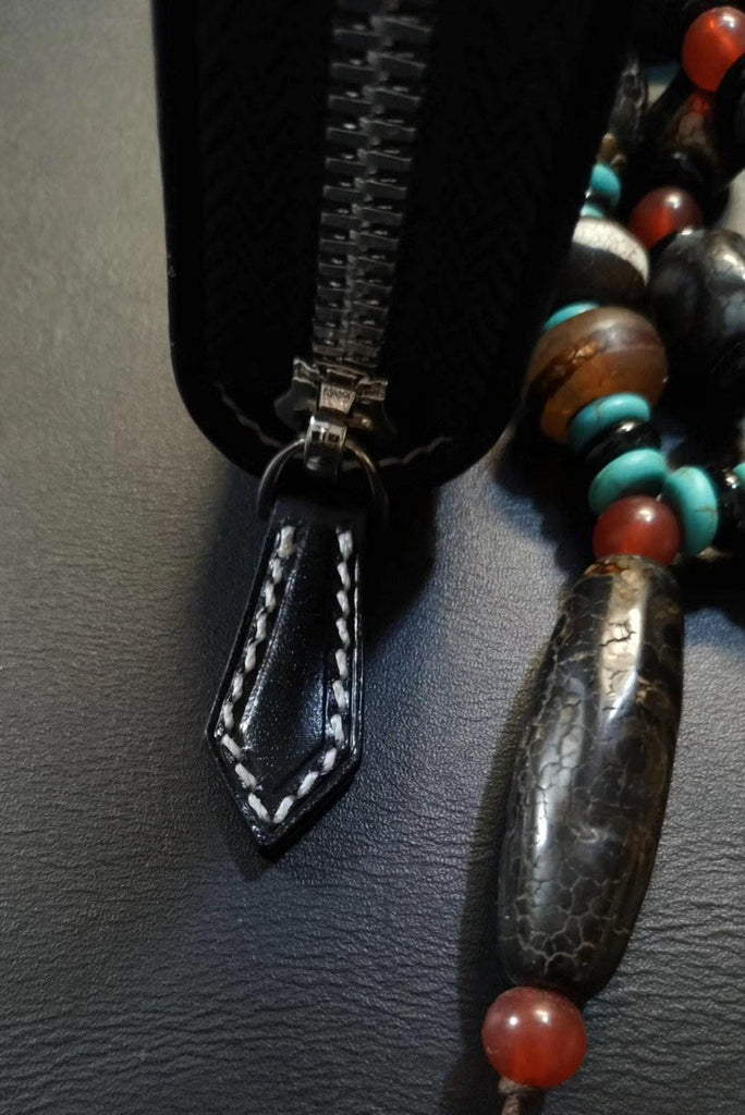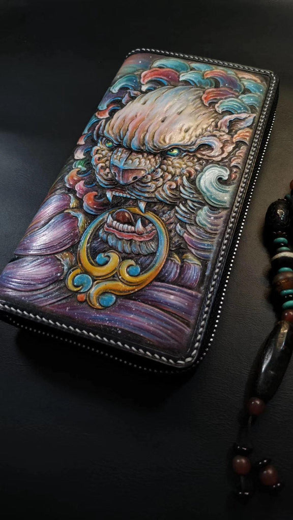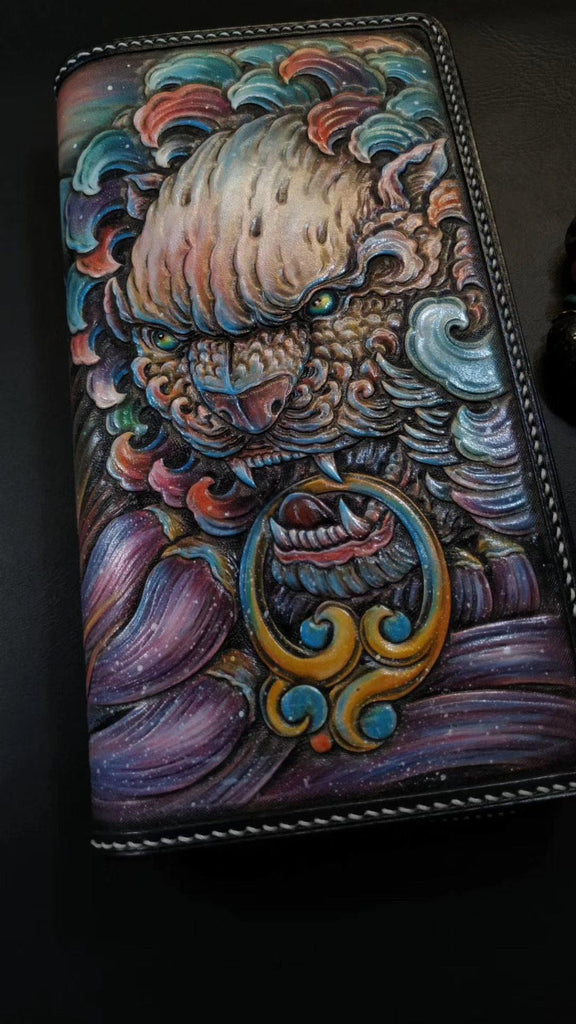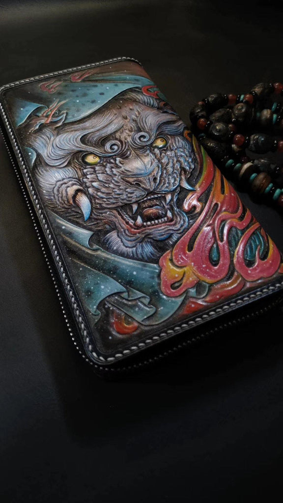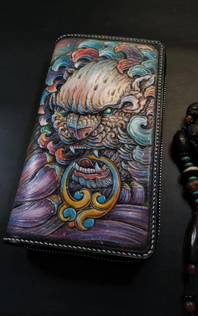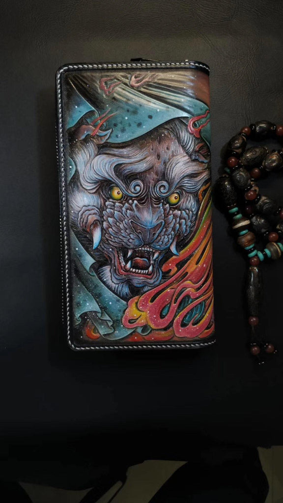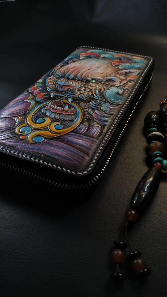 Design: Badass Black Leather Men's Dragon Head Biker Wallet Handmade Tooled Zipper Long Wallets For Men