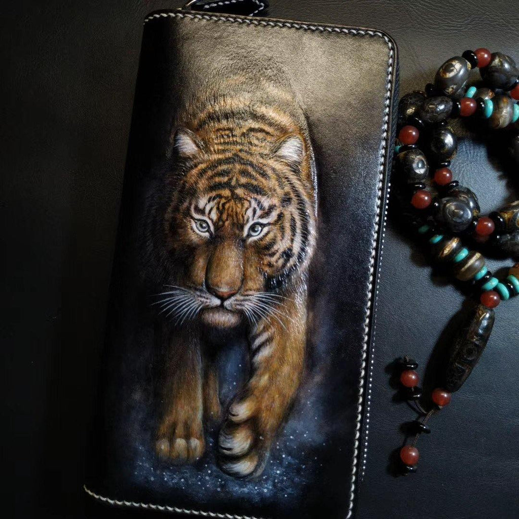 Design: Badass Black Leather Men's Tiger Long Biker Wallet Handmade Tooled Zipper Long Wallets For Men
