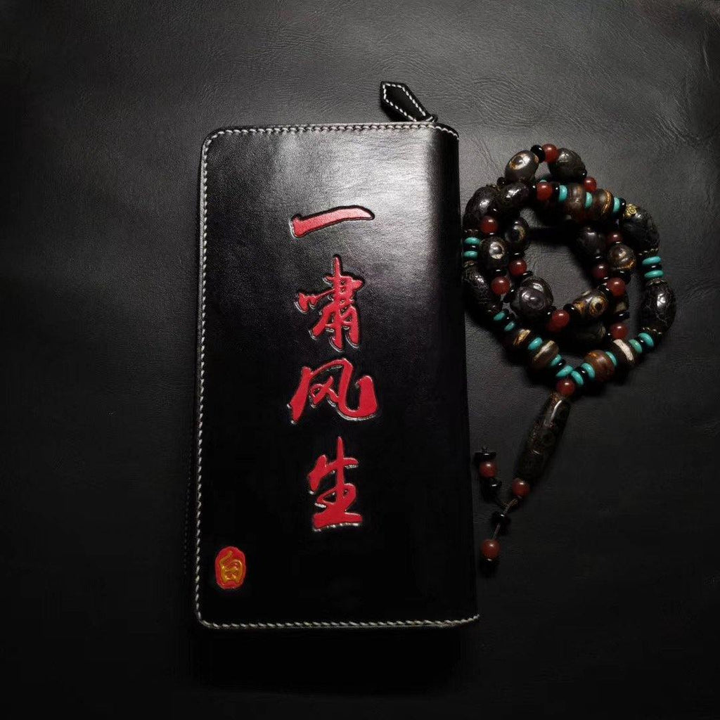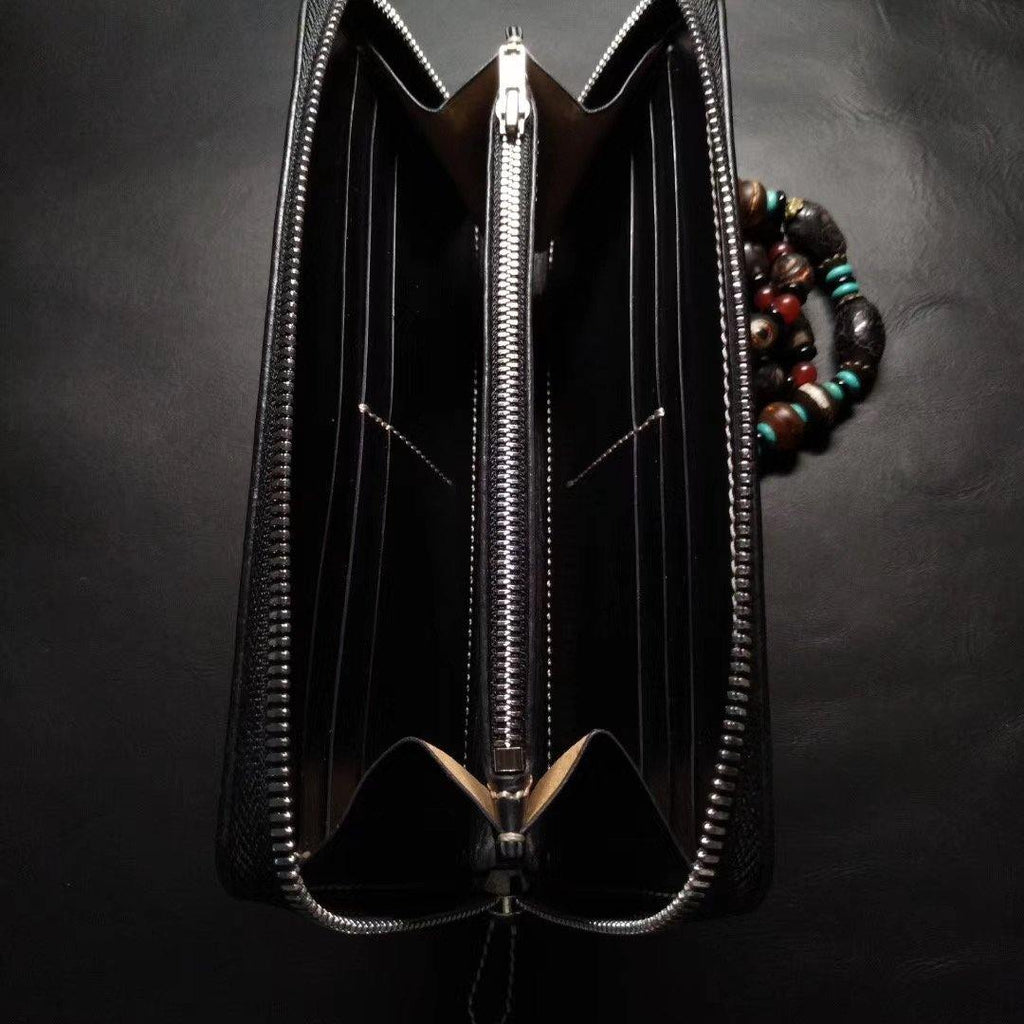 Style: Badass Black Leather Men's Tiger Long Biker Wallet Handmade Tooled Zipper Long Wallets For Men
