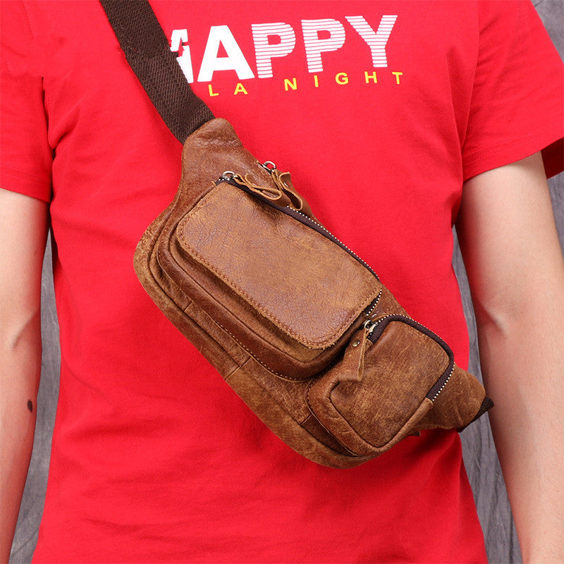 Style: Badass Matte Leather Backpack Men's Brown Sling Bag Chest Bag Multi-function One shoulder Backpack Waist Bag For Men