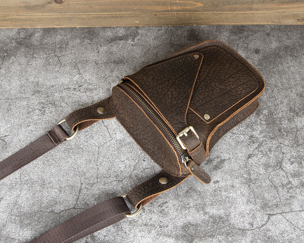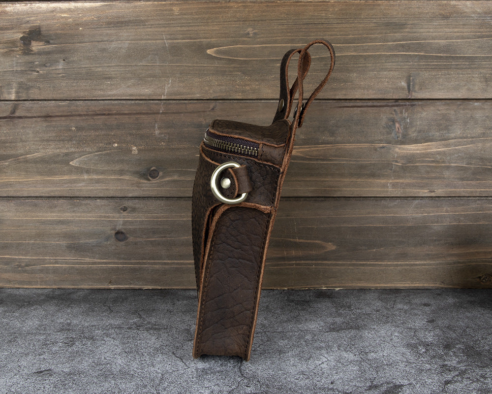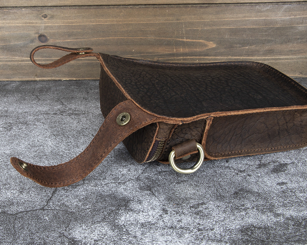 Discover the perfect fusion of timeless craftsmanship and modern functionality with our premium Full Grain Leather Belt Bag. Expertly crafted from luxurious full-grain leather with a distinctive texture reminiscent of elephant hide, this rugged yet refined Holster Belt Bag measures 18cm x 19cm x 4cm, offering a structured silhouette that maintains its shape even when empty. The rich dark brown hue and natural grain patterns create a vintage aesthetic that improves with age, making this versatile bag an enduring companion for your daily adventures.