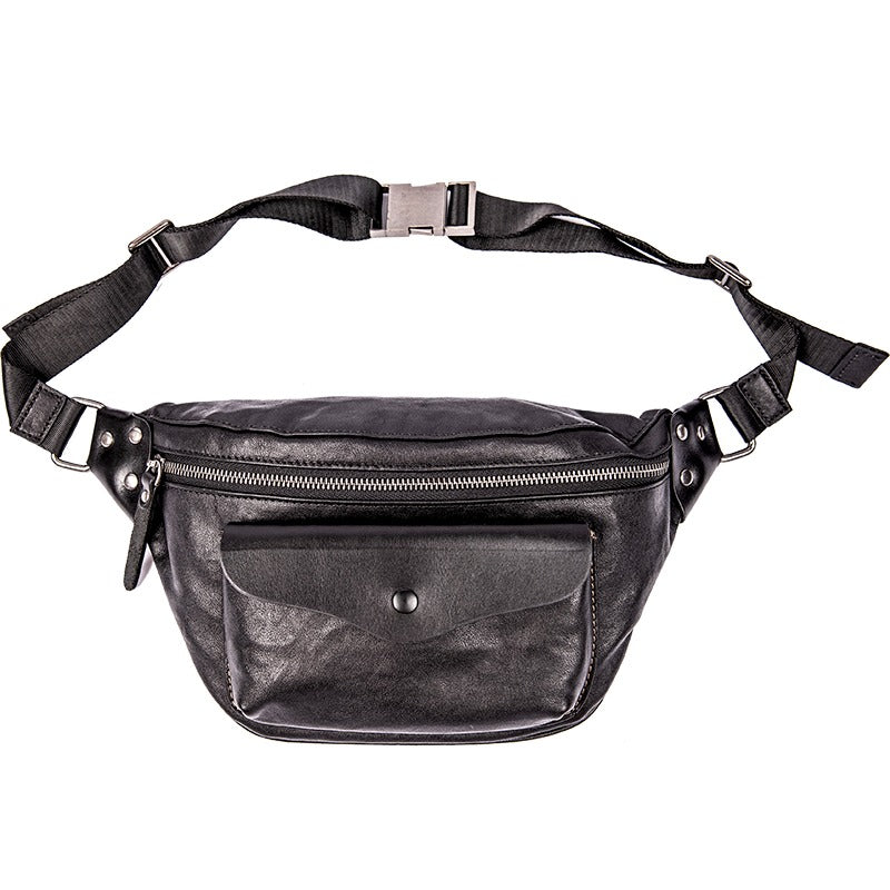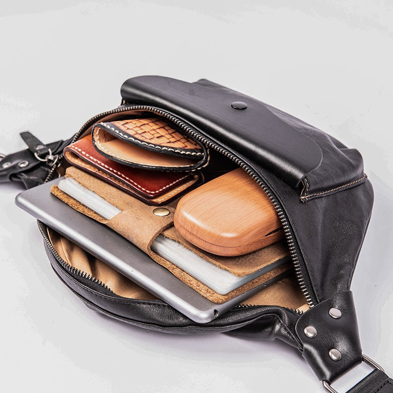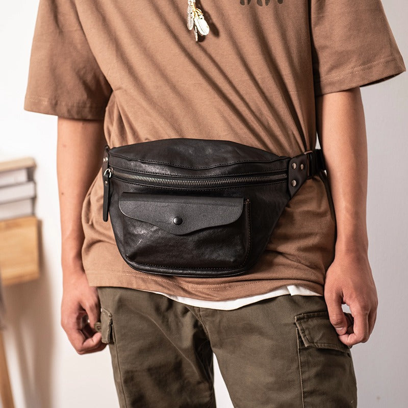 Style: Black Leather Fanny Pack Men's Black Chest Bag Hip Pack Ipad Mini Waist Bag For Men
