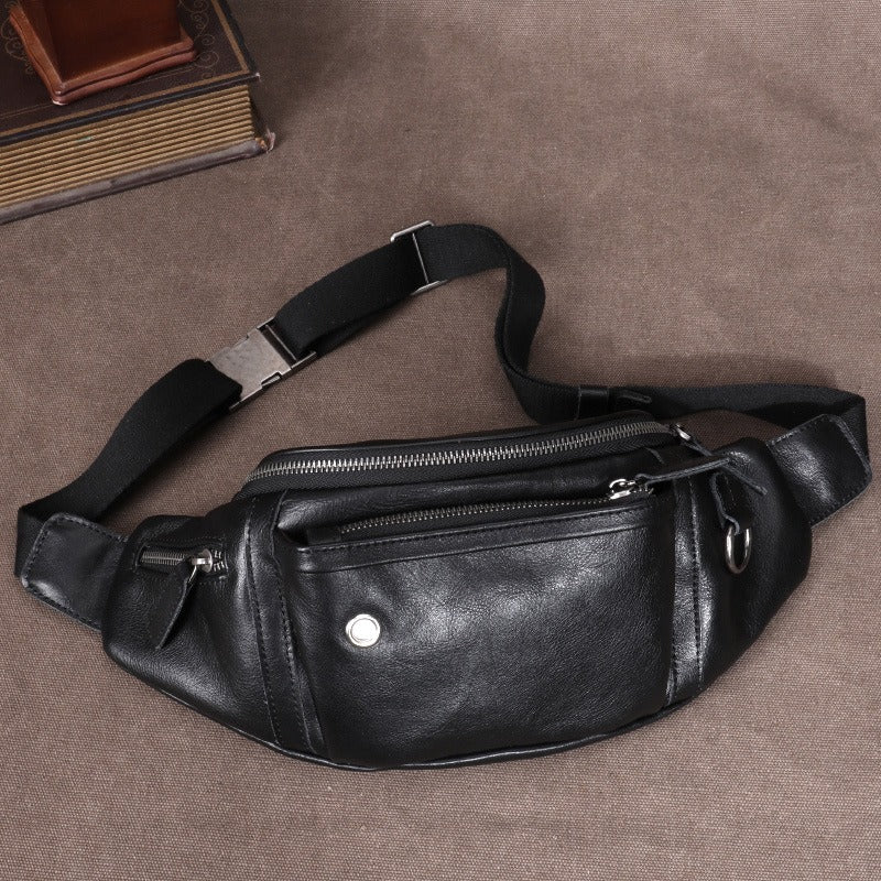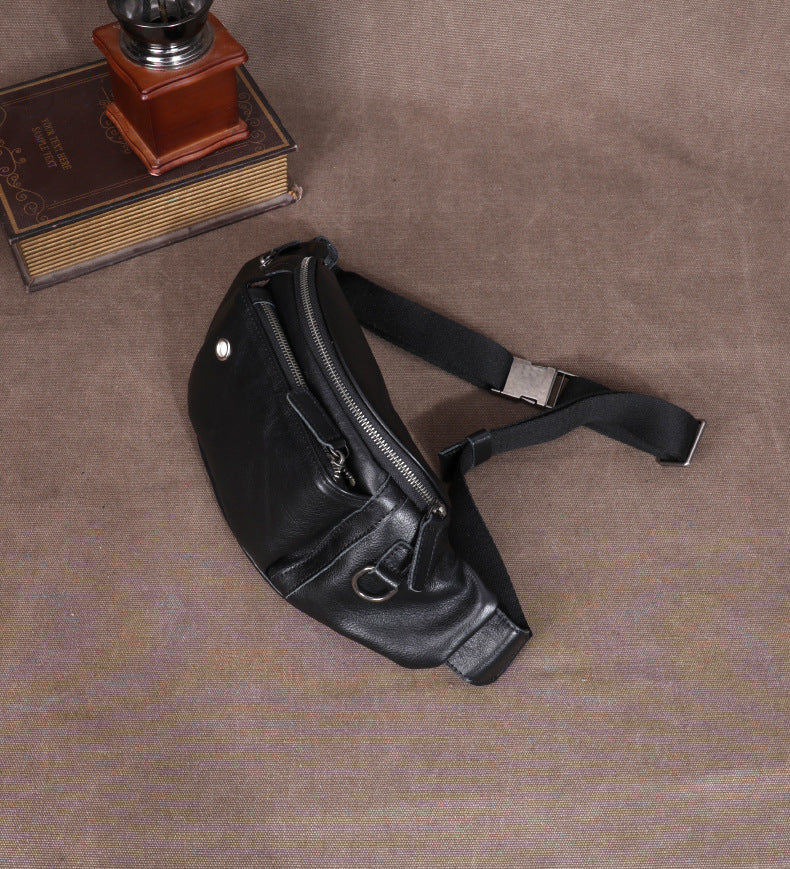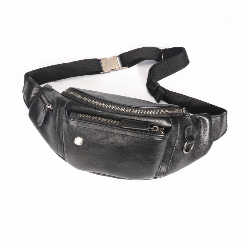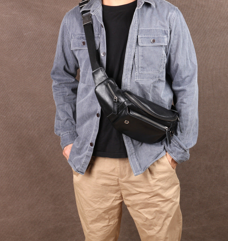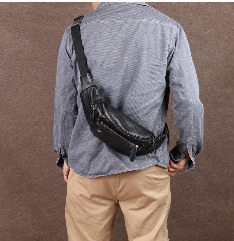 Design: Black Leather Men Fanny Pack Waist Bag Leather Hip Pack Bum Pack For Men