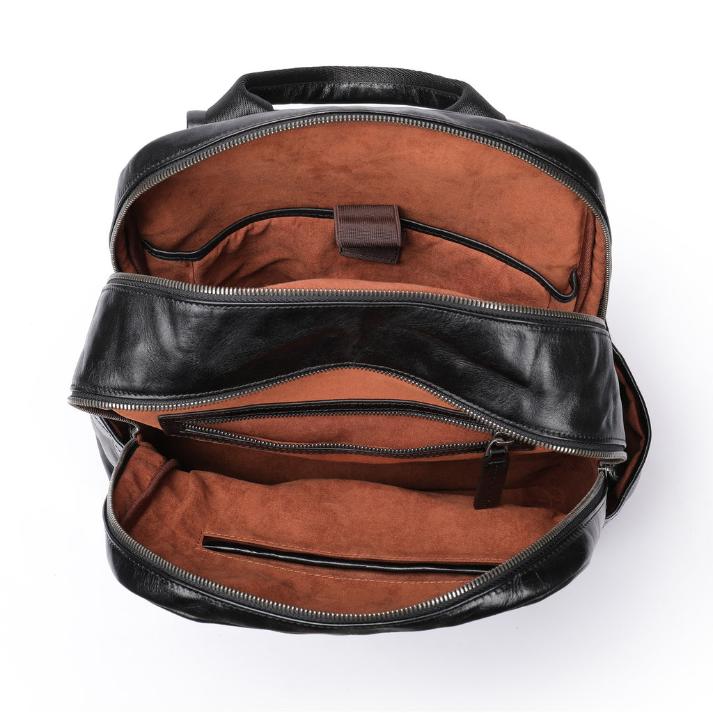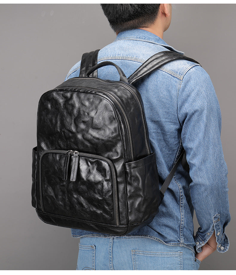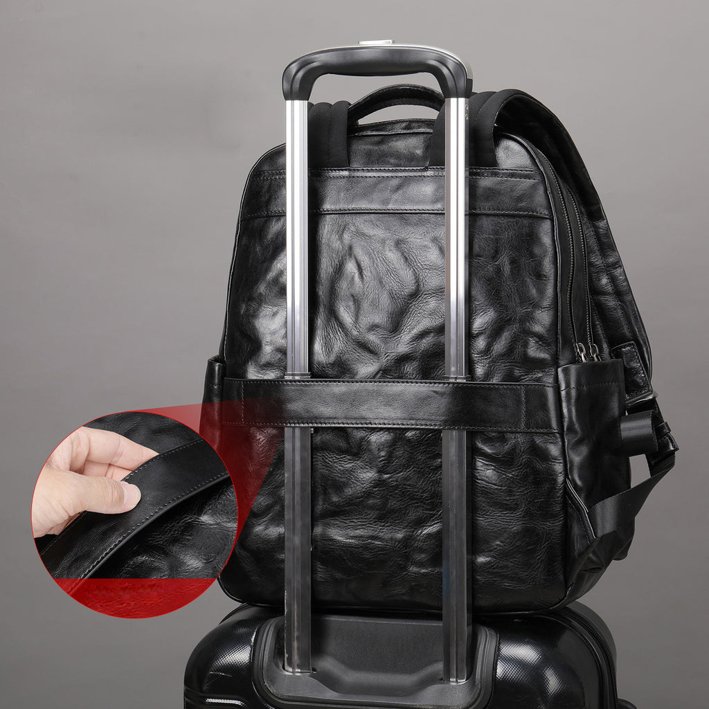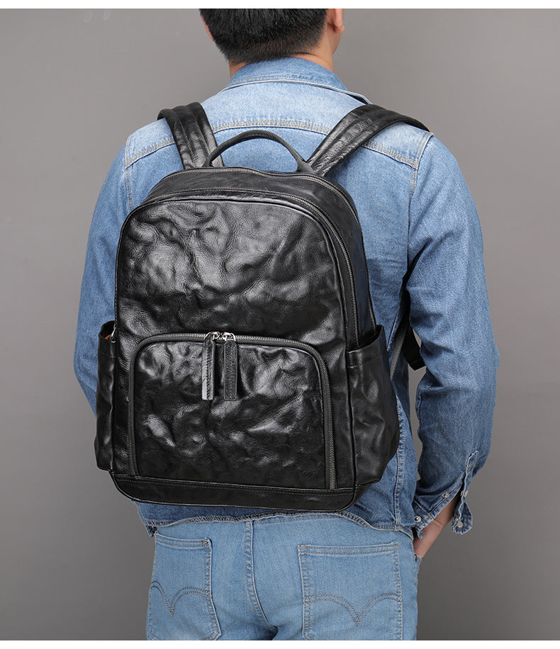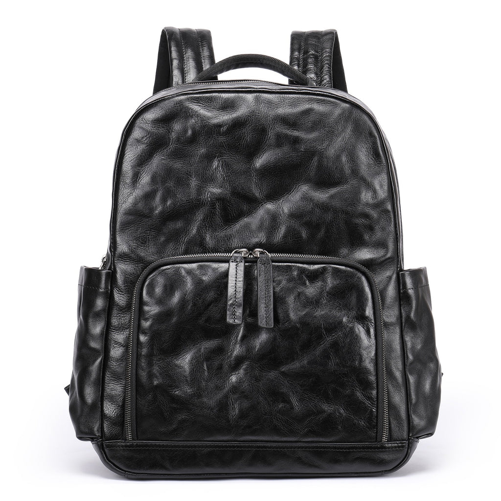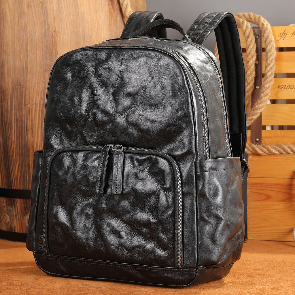 Design: Black Leather Mens Backpack 15'' Laptop Rucksack Wrinkle School Backpack For Men