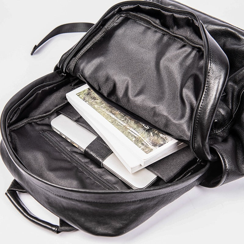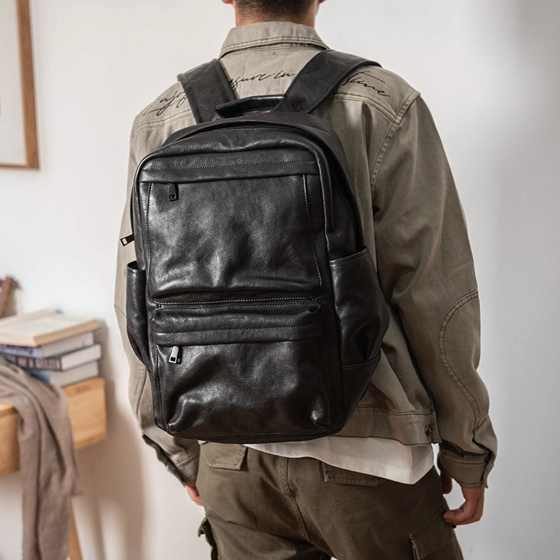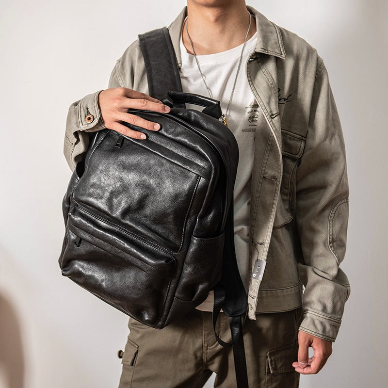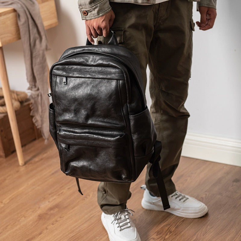 Design: Black Leather Mens Backpack 16'' Laptop Rucksack Black School Backpack For Men