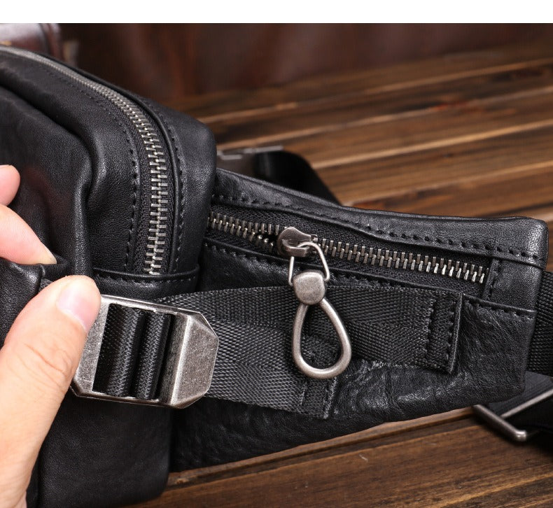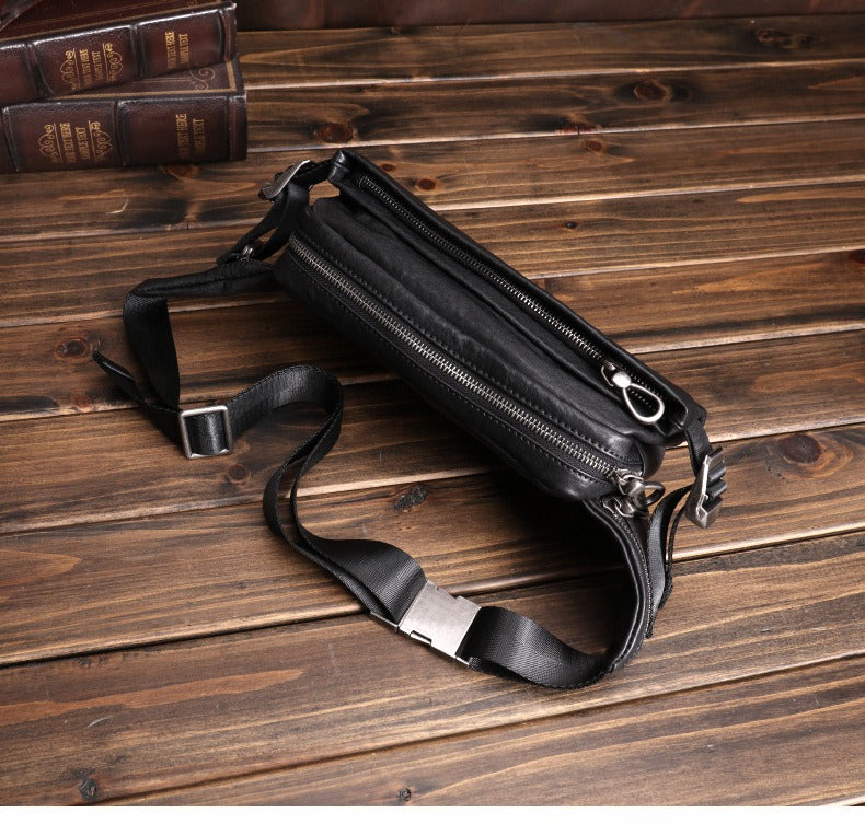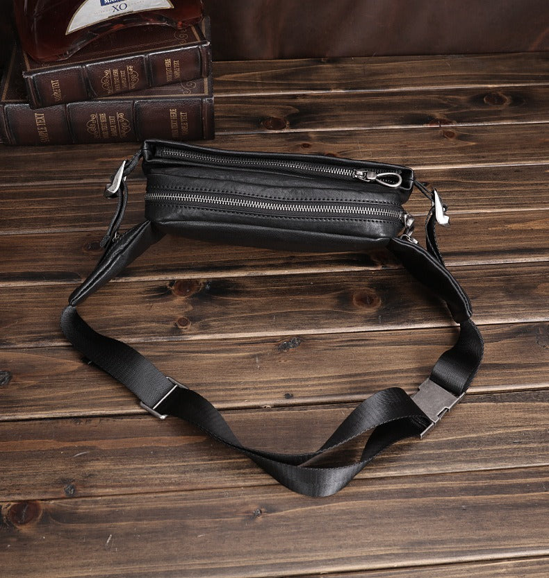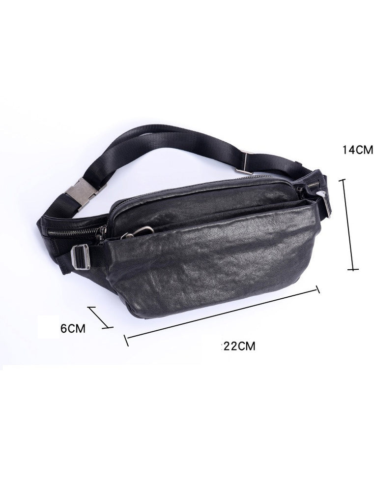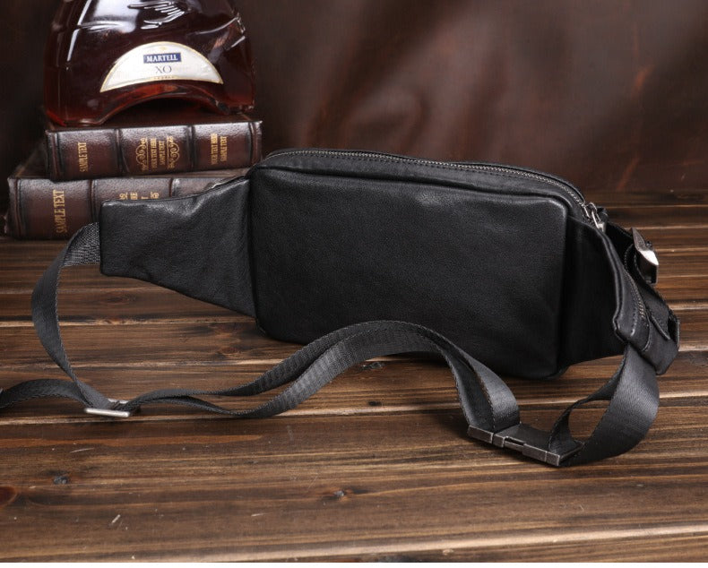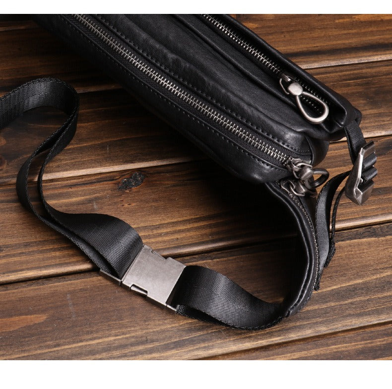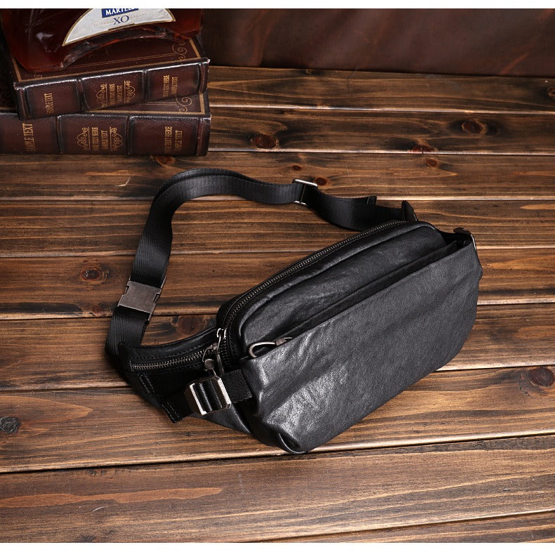 Design: Black Leather Waist Bags Mens Slim Fanny Packs Hip Packs Sling Bags Sling Pack for Men
