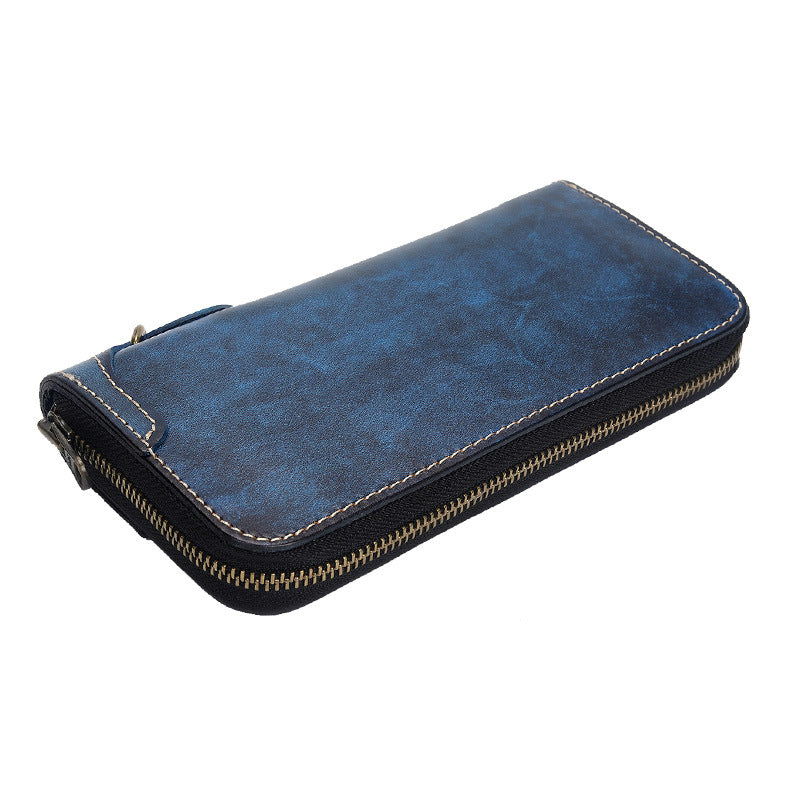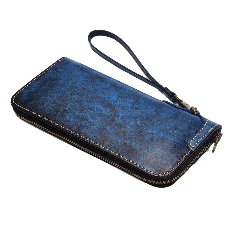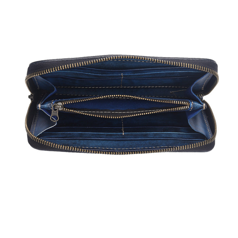 Style: Blue Wristlet Leather Wallets Handmade Zipper Long Wallets For Men