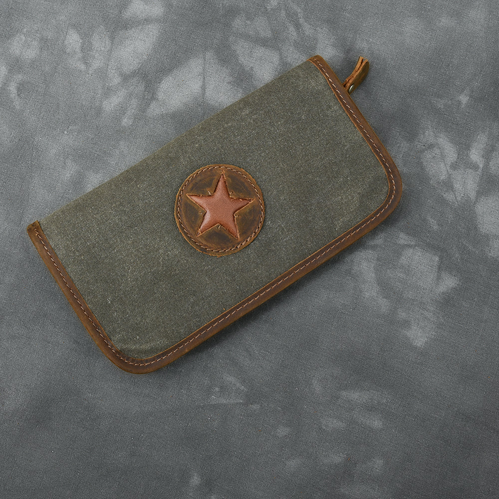 Design: Brown Canvas Leather Mens Long Wallet Army Green Large Clutch Phone Case For Men
