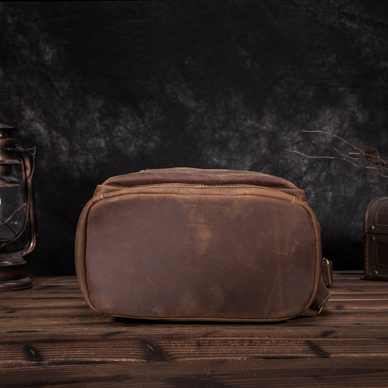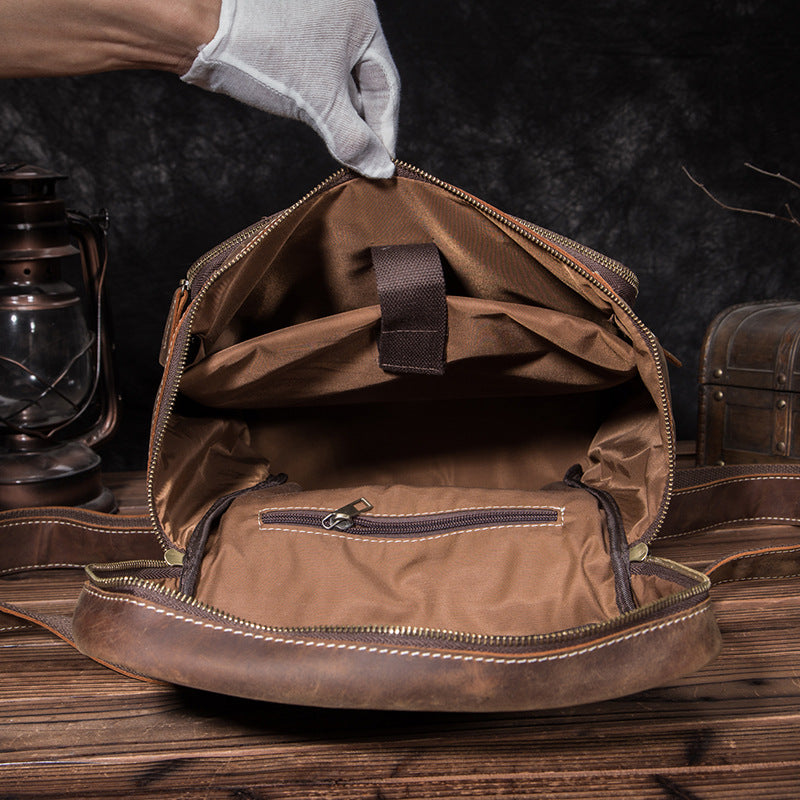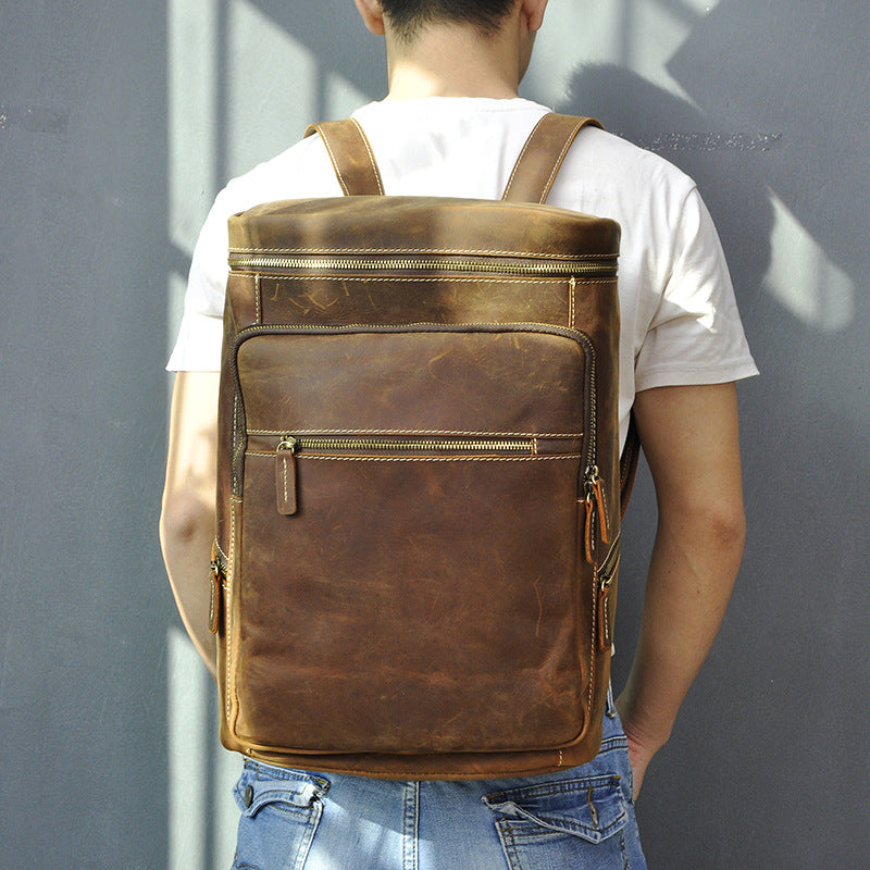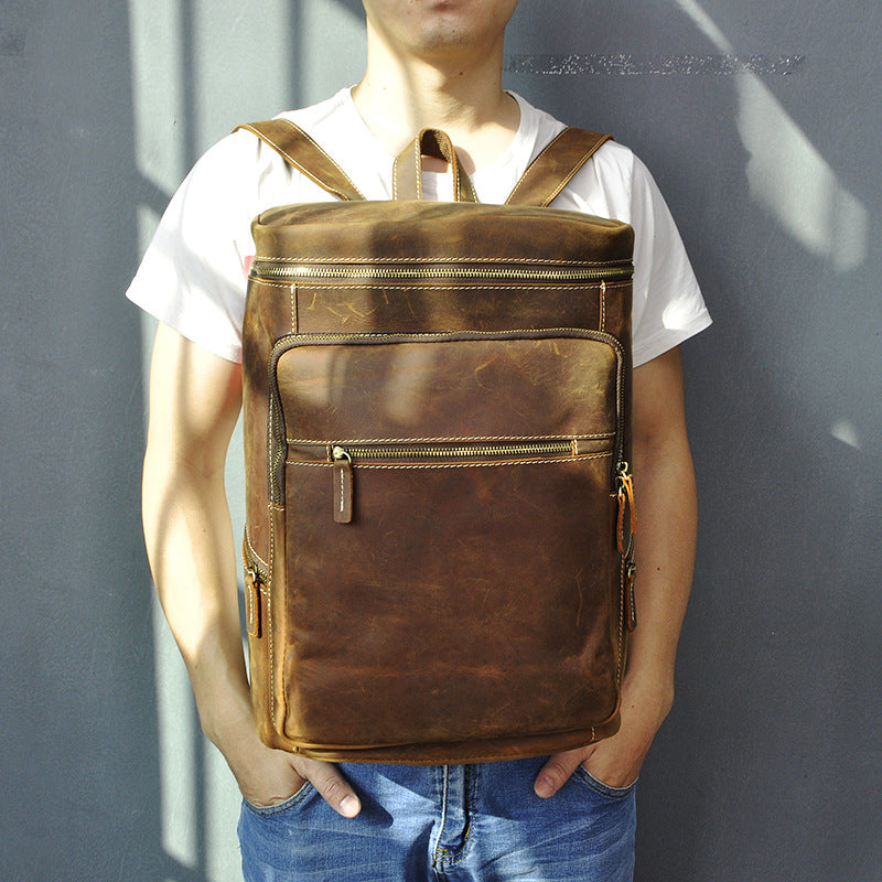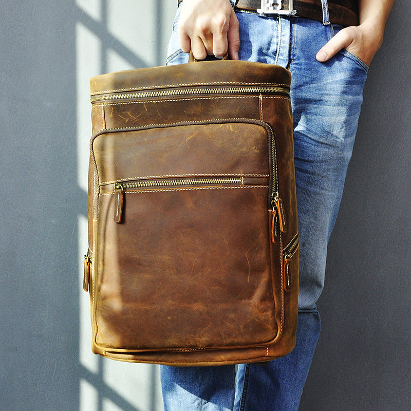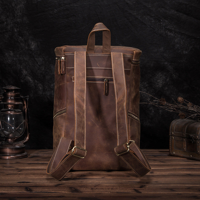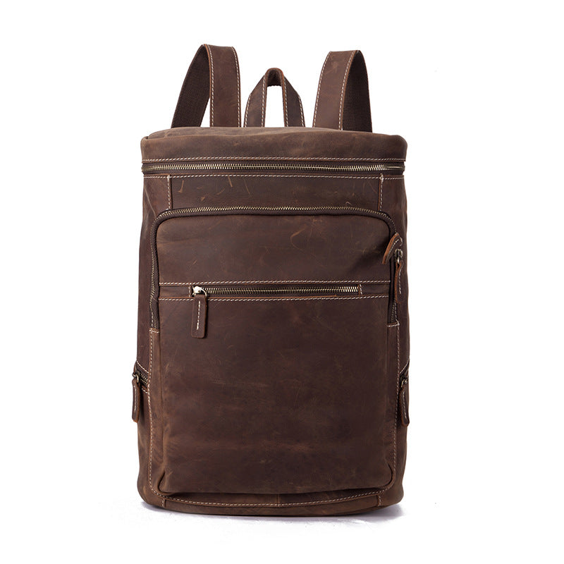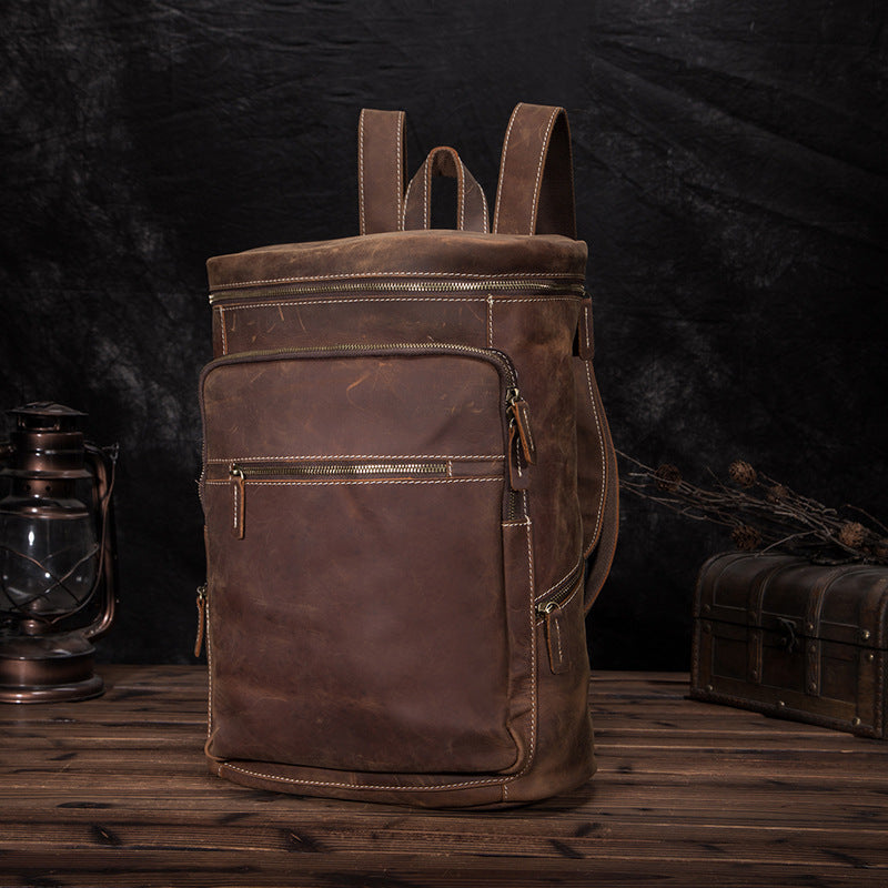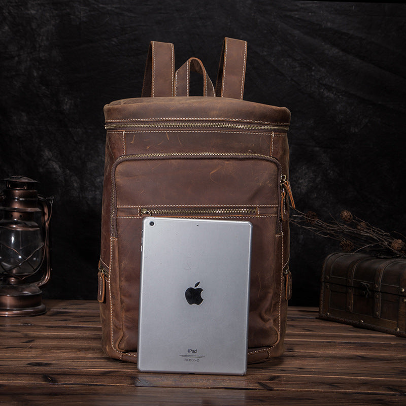 Brown Leather Men's 14 inches Large Barrel Computer Backpack Cylinder Travel Backpack Large College Backpack For Men