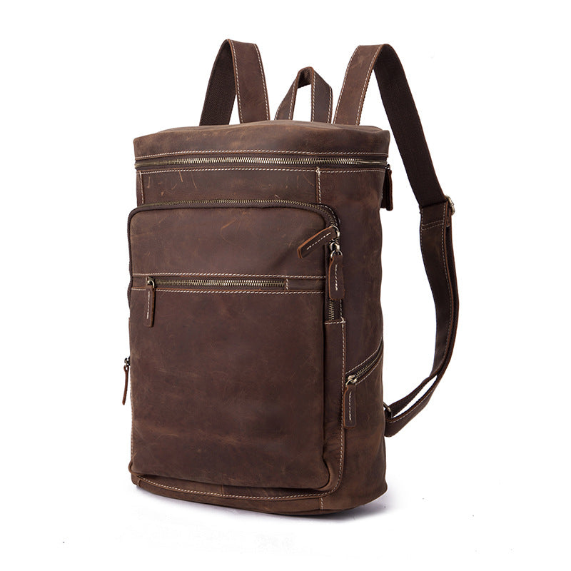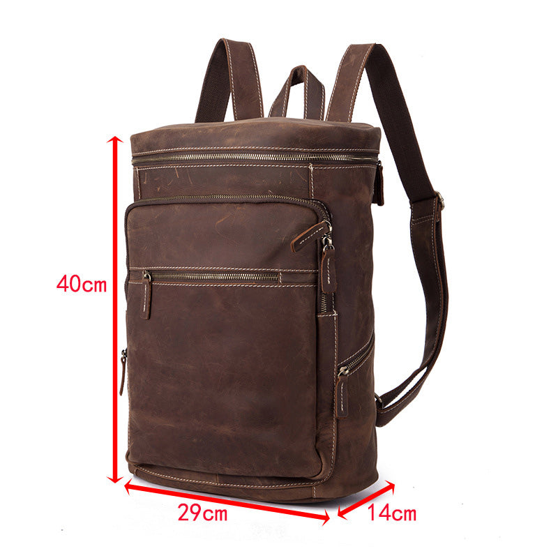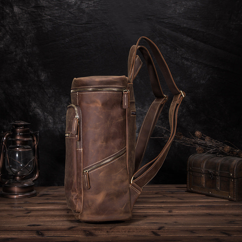 Design: Brown Leather Men's 14 inches Large Barrel Computer Backpack Cylinder Travel Backpack Large College Backpack For Men
