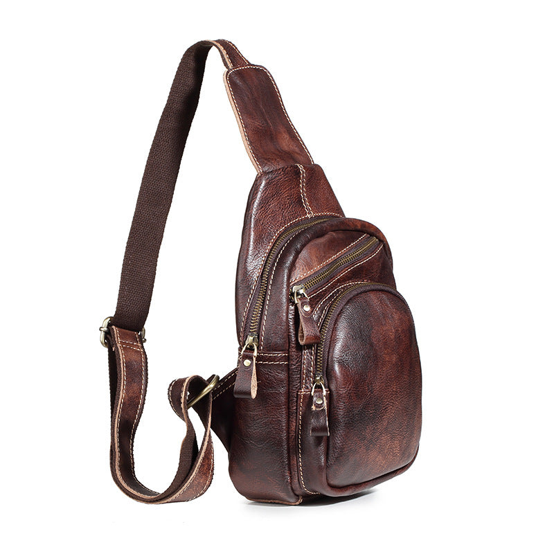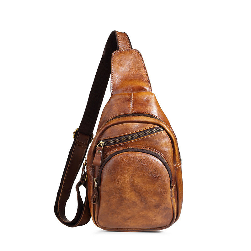 Design: Brown Cool LEATHER MENS 8 inches Messenger Bag One Shoulder Backpack Yellow Chest Bag For Men