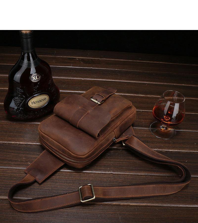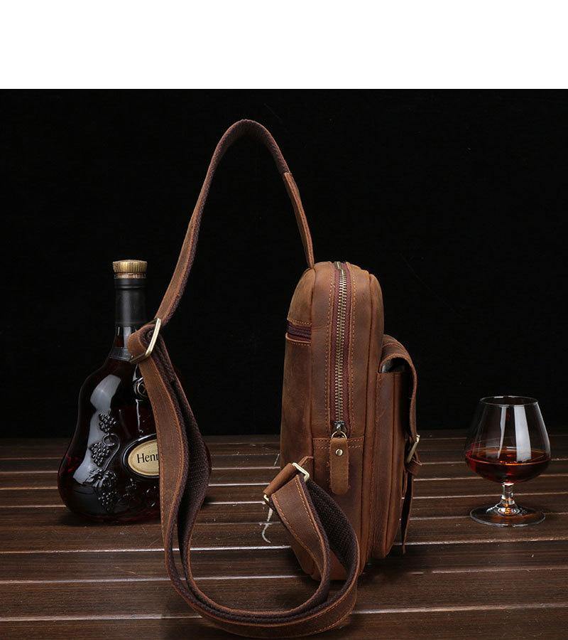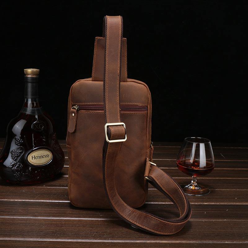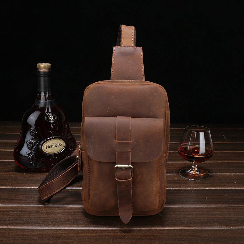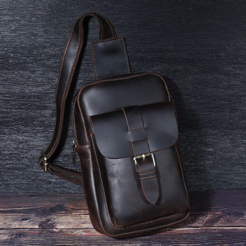Style: Brown Cool LEATHER MENS 8 inches Sling Bags One Shoulder Backpack Dark Brown Chest Bag For Men
