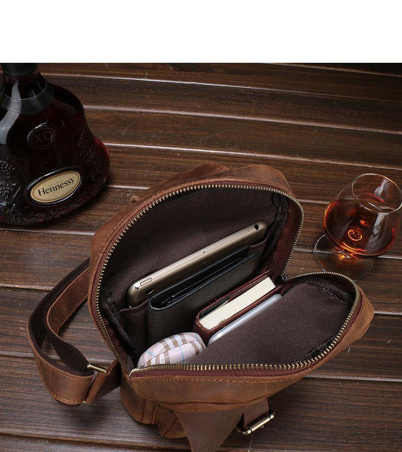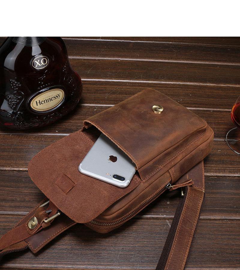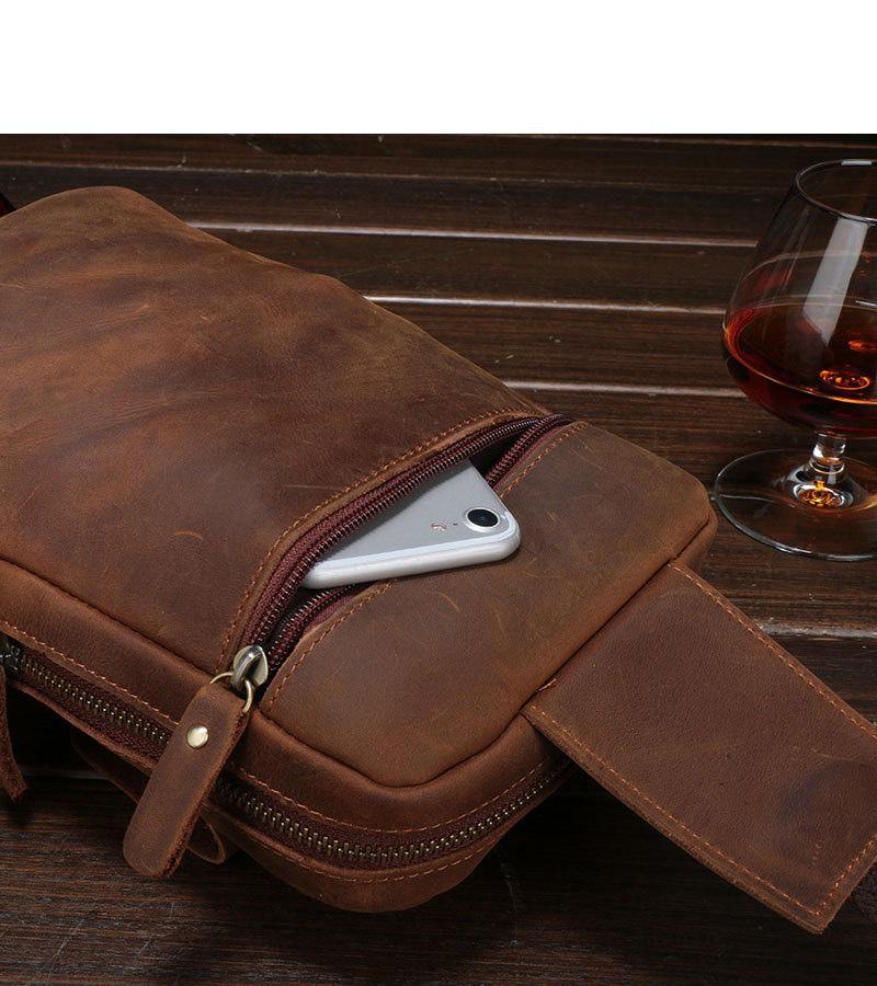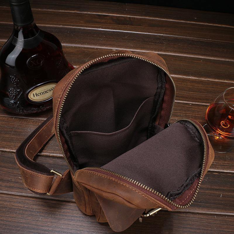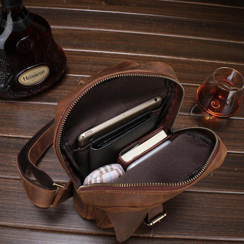 Style: Brown Cool LEATHER MENS 8 inches Sling Bags One Shoulder Backpack Dark Brown Chest Bag For Men