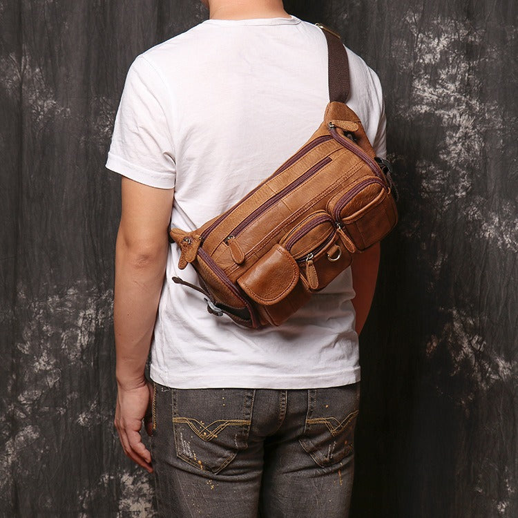 Design: Brown Leather Mens Fanny Packs Barrel Bum Bags Cool Waist Bag for Men