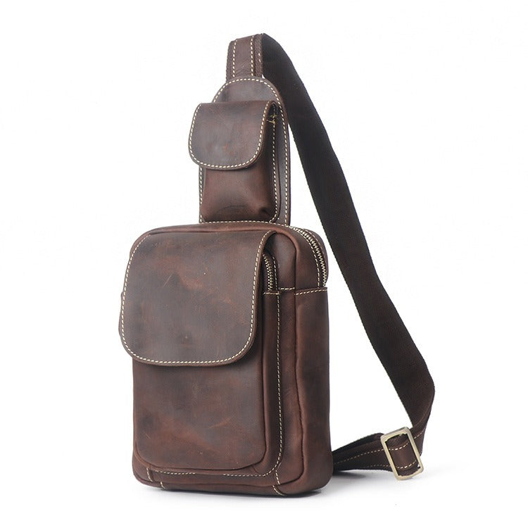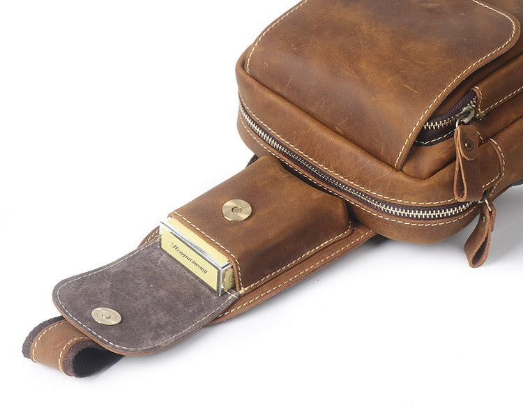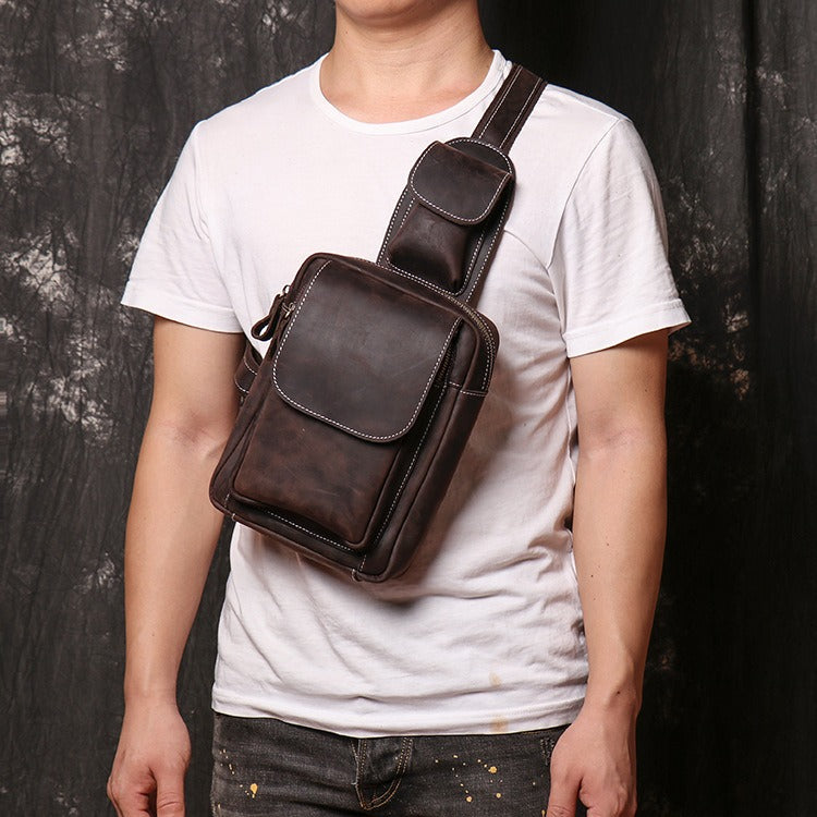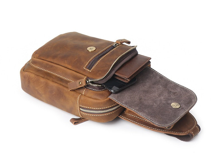Design: Brown Leather Men's Chest Bag Sling Bag Brown One shoulder Backpack Sling Pack For Men