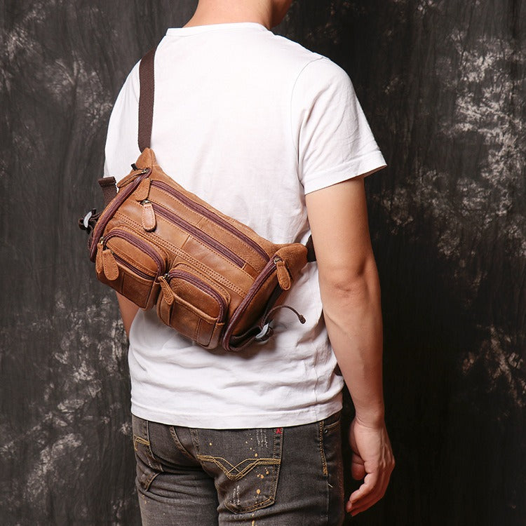 Design: Brown Leather Mens Fanny Packs Barrel Bum Bags Cool Waist Bag for Men