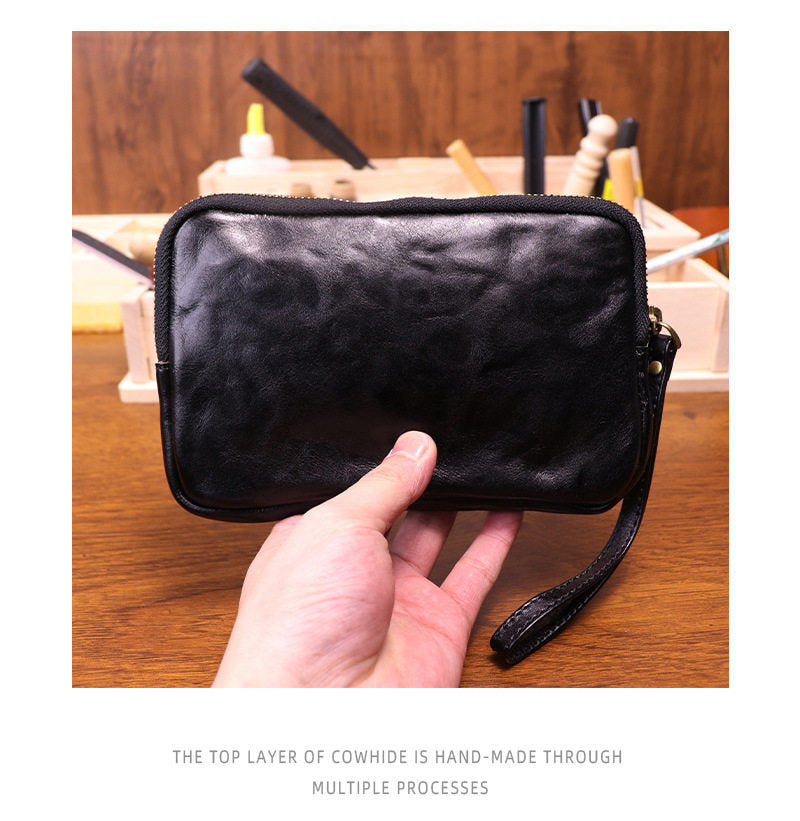Designed for quick access and secure carry, this Wristlet Clutch Wallet features a main compartment and an exterior zippered pocket, providing just enough space for your smartphone, cash, smoking accessories, and daily necessities. While intentionally minimalist in organization—focusing on spacious slots rather than dedicated card holders—this Leather Wallet Clutch ensures your most-used items are always within reach. The integrated wrist strap adds convenience, allowing you to carry it comfortably in hand, tuck it under your arm, or secure it around your wrist for hands-free moments. Whether you’re heading to the office, traveling, or stepping out for the evening, this clutch delivers both style and substance in a beautifully understated package.