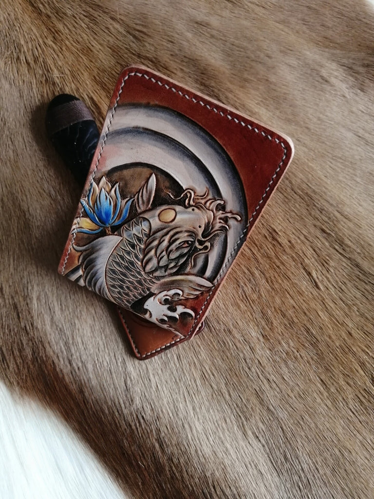 Style: Carp Tooled Leather Wallet Card Wallet with ID Window Koi ID Holder Wallet