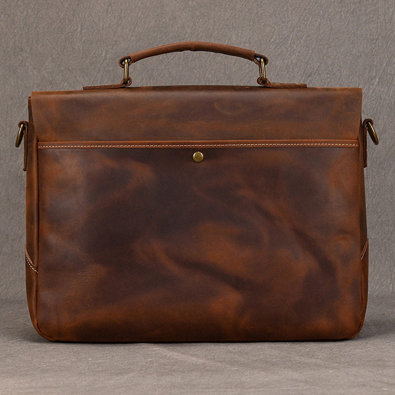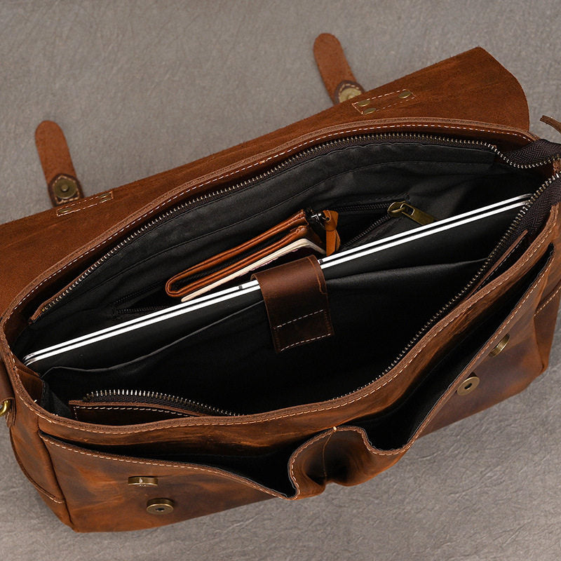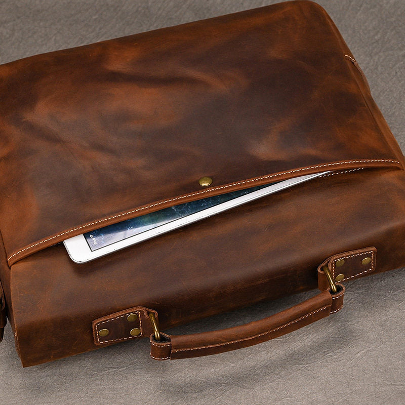 Whether you're commuting to the office, traveling for business, or heading out for the day, this brown leather laptop briefcase is designed to keep your belongings secure and well-organized. The interior includes a dedicated 14-inch laptop sleeve, multiple slots for pens, phone, wallet, and a zippered pocket for smaller items. The back also features a discreet slot perfect for an iPad or tablet. From books and files to an umbrella and Kindle, this briefcase adapts effortlessly to your needs, making it a versatile and sophisticated accessory for any occasion.