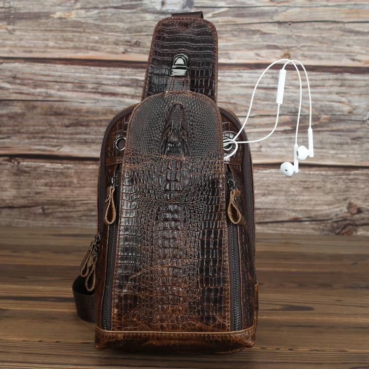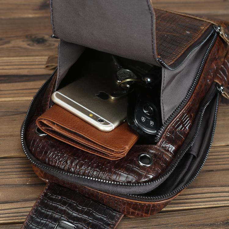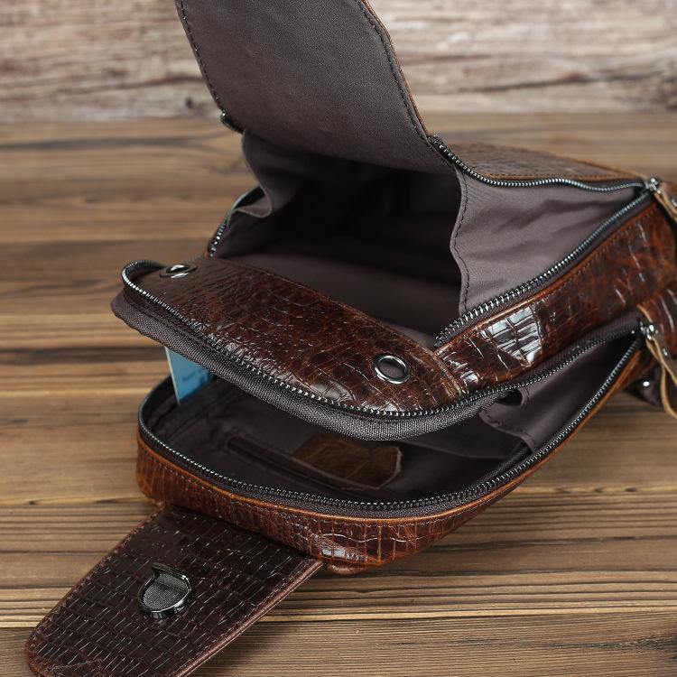 Design: Coffee Crocodile Pattern Leather Backpack Men's 8-inch Sling Bag Chest Bag One shoulder Backpack Sports Bag For Men
