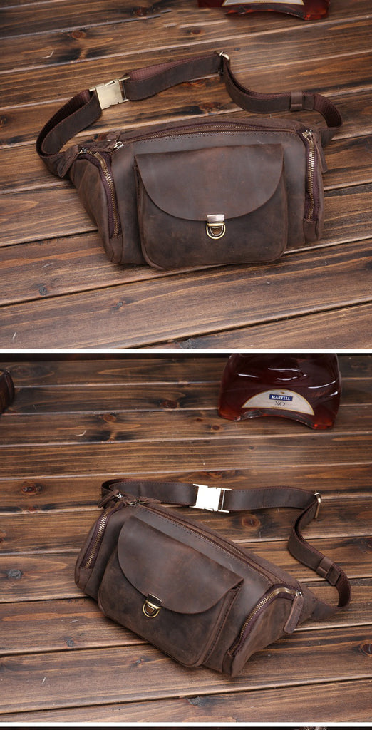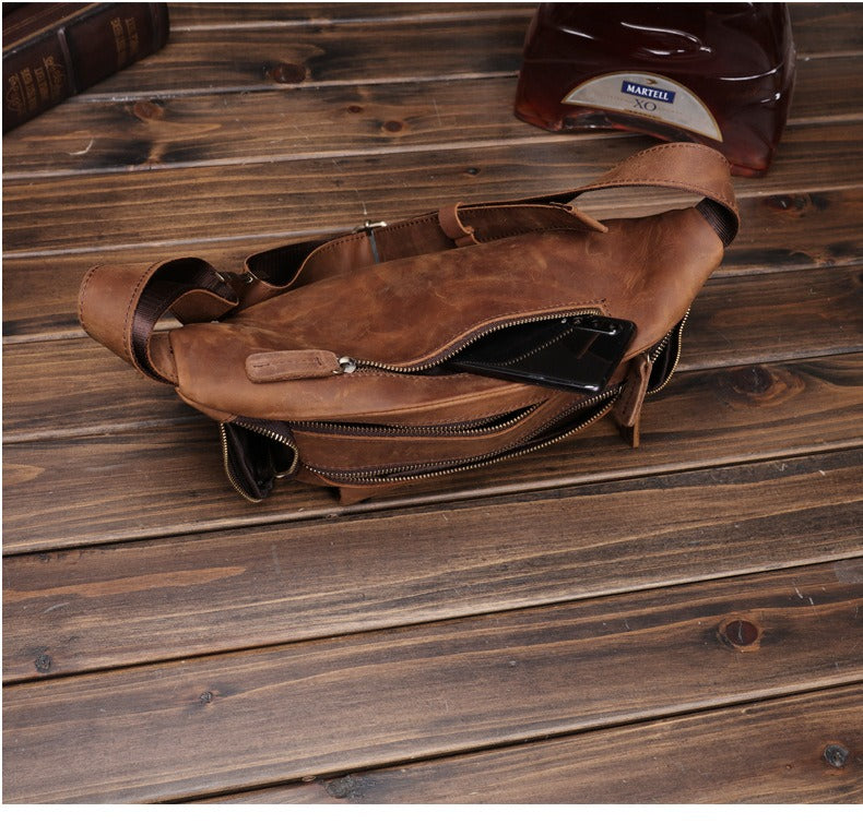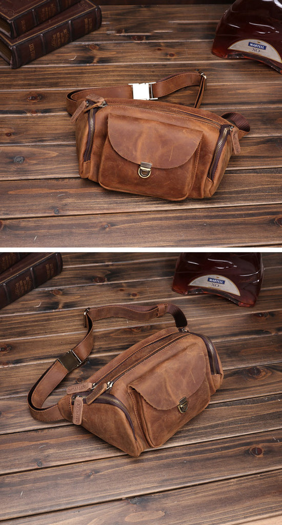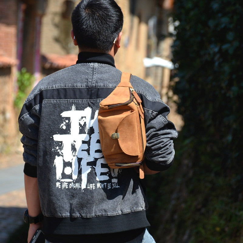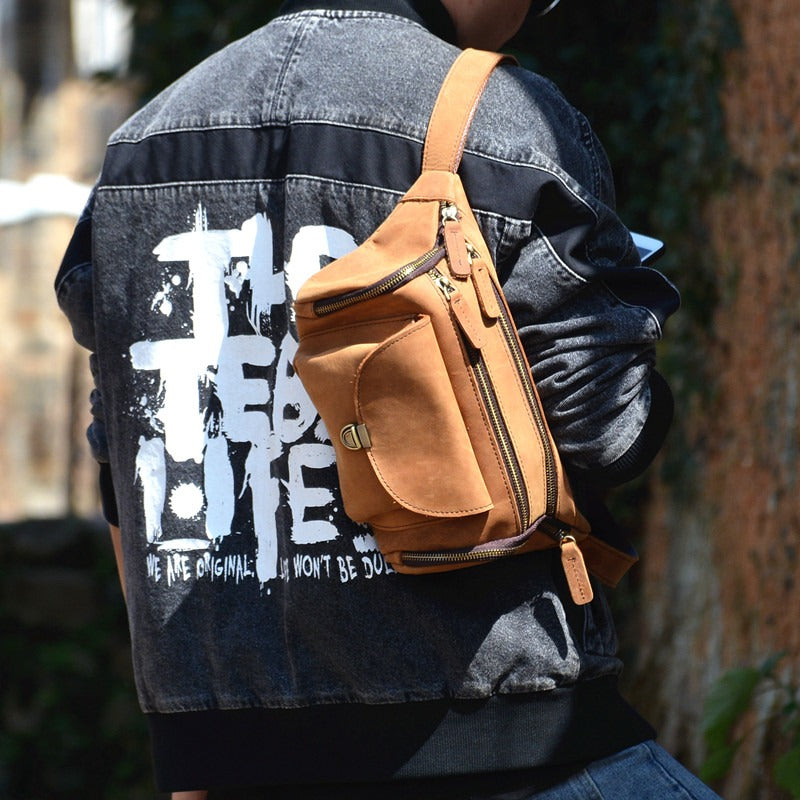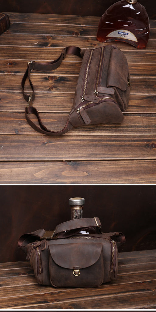 Design: Brown Leather Mens Fanny Packs Hip Packs Sling Bags Sling Pack Waist Bags for Men