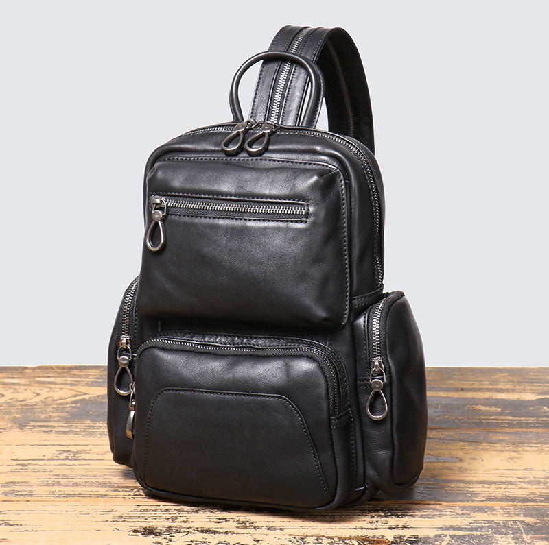 Engineered for practicality and style, this Leather Sling Backpack for Men includes two front zippered pockets, a main zippered compartment, two side zippered pockets, a discreet back vertical security pocket, and interior organization with a dedicated wallet slot and a zippered pocket. Whether you're commuting, exploring the city, or traveling light, this bag keeps your belongings secure, organized, and easily accessible. Wear it as a sling for quick access and a minimalist look, or convert it to a backpack for even weight distribution and added stability. Perfect for an iPad Mini, daily tech, and everyday carry, this bag is as functional as it is fashionable.