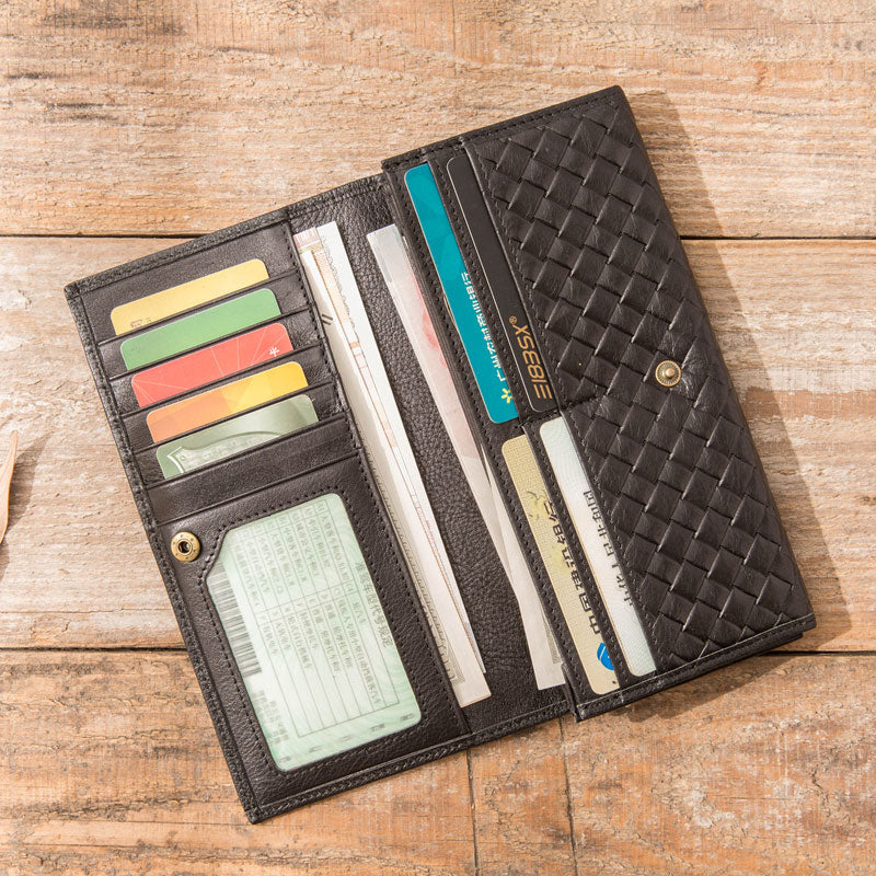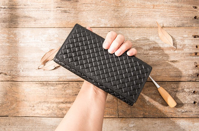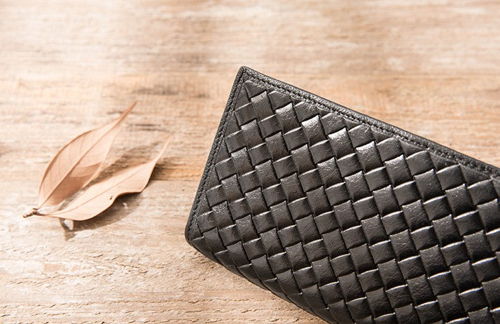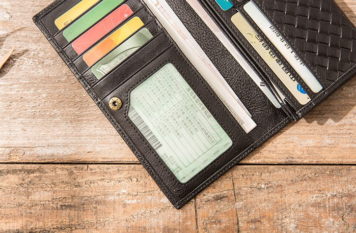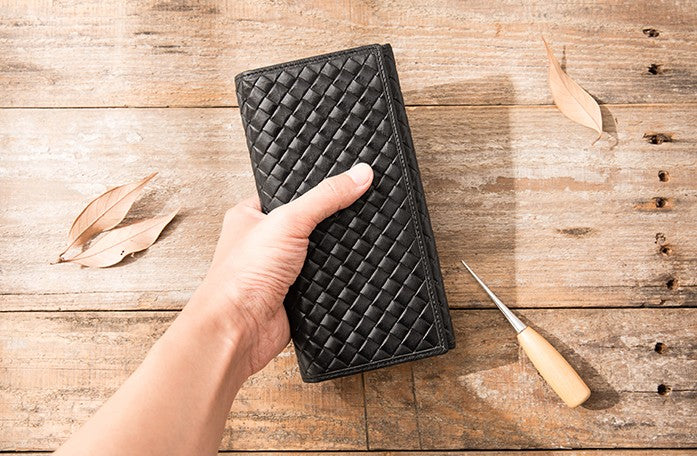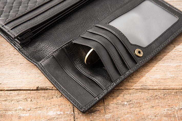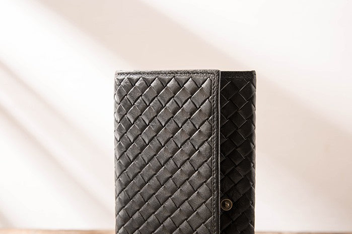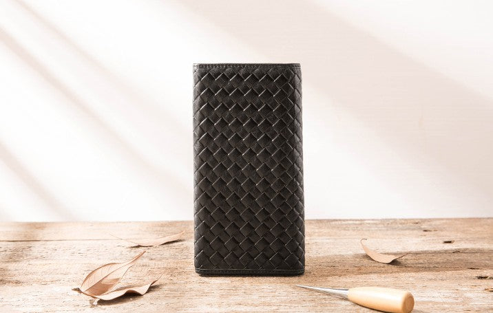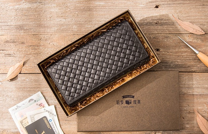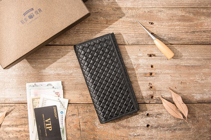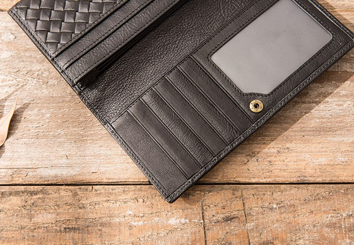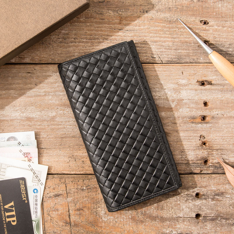 Style: Cool Black Braided Leather Mens Long Wallet Long Wallet for Men
