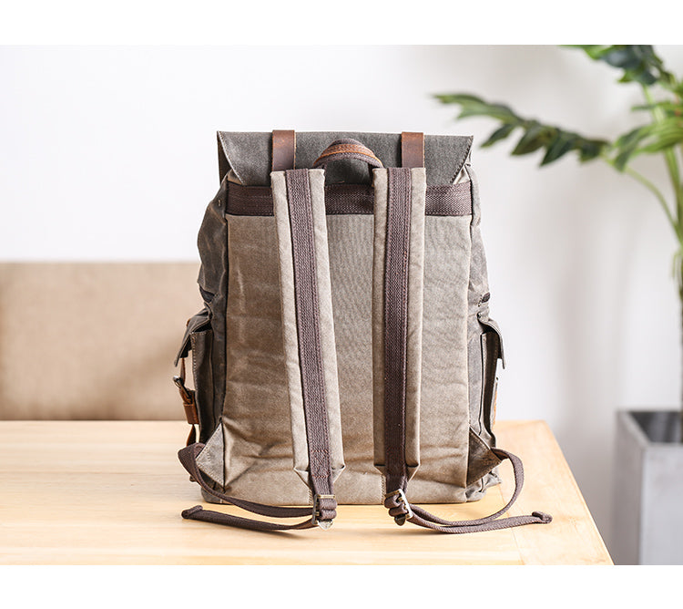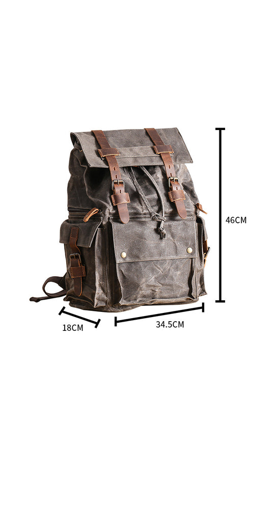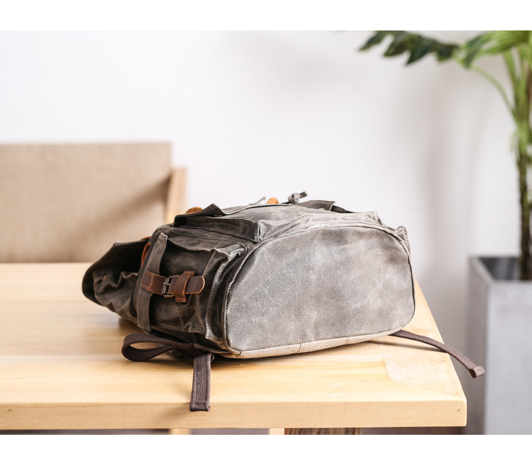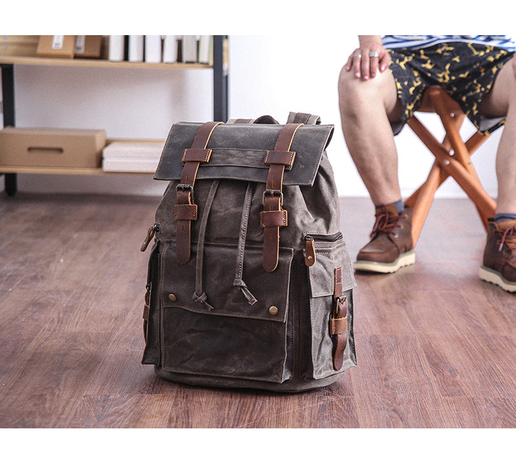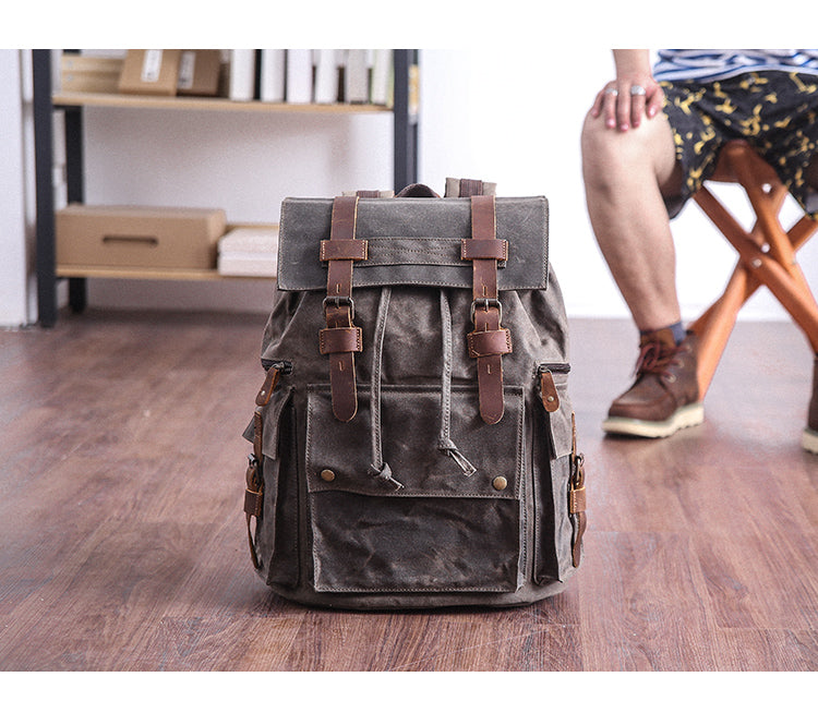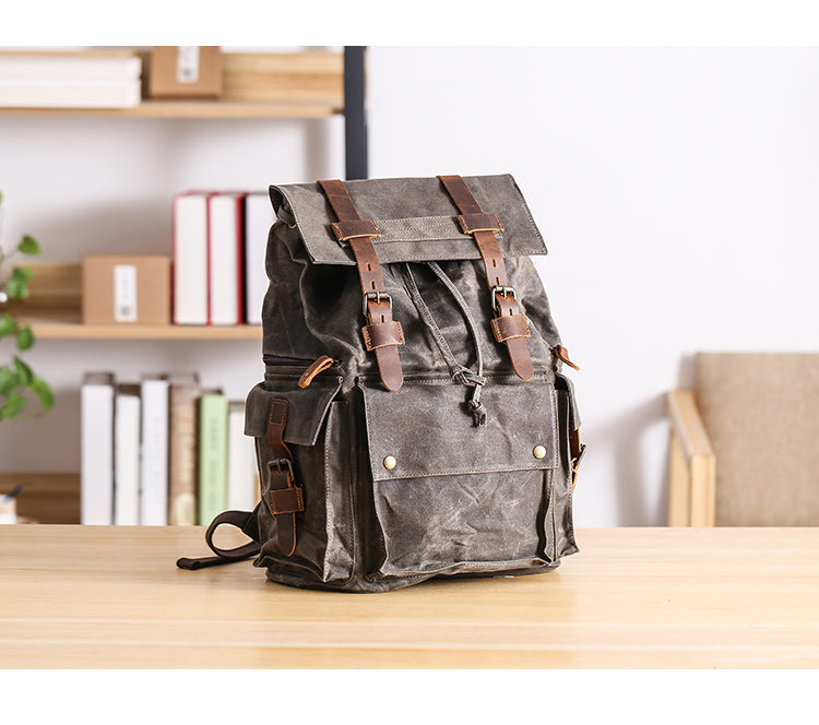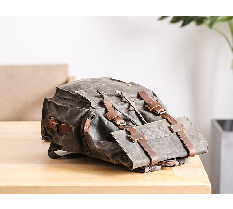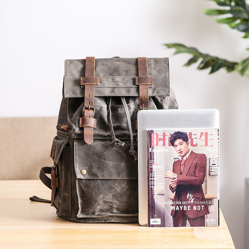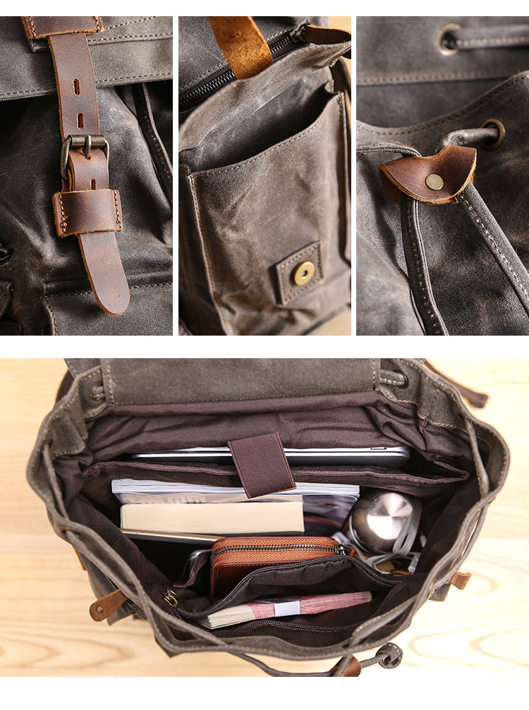 Waxed Canvas Leather Mens Gray Waterproof 15‘’ Large Backpack Travel Backpack College Backpack for Men