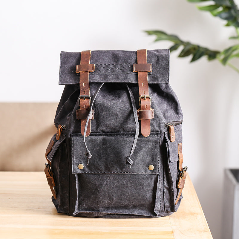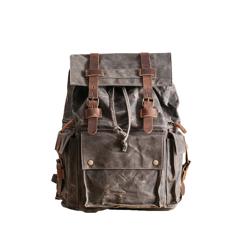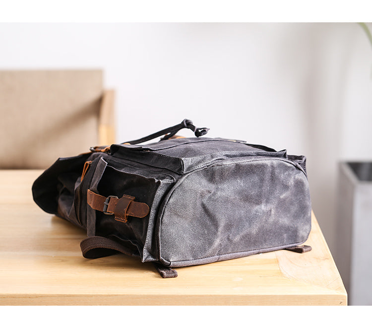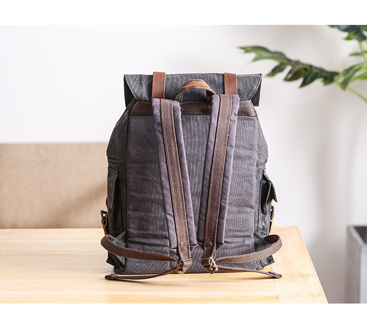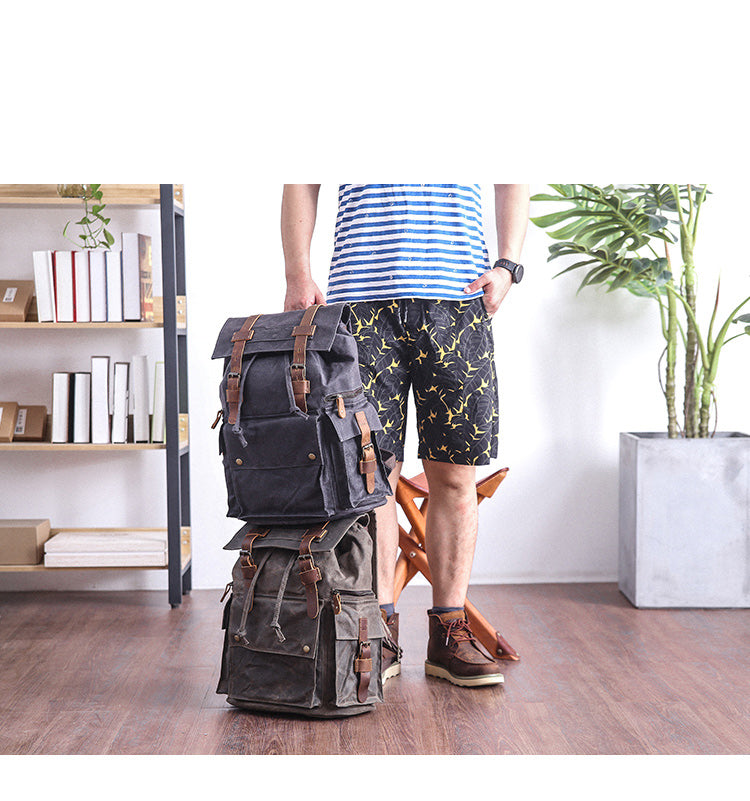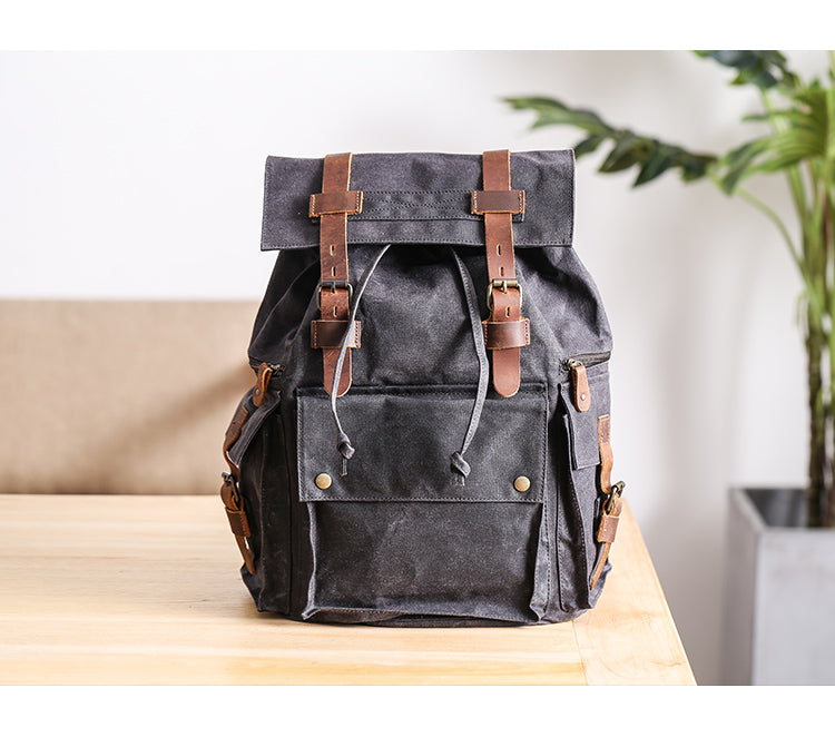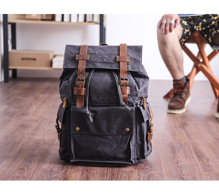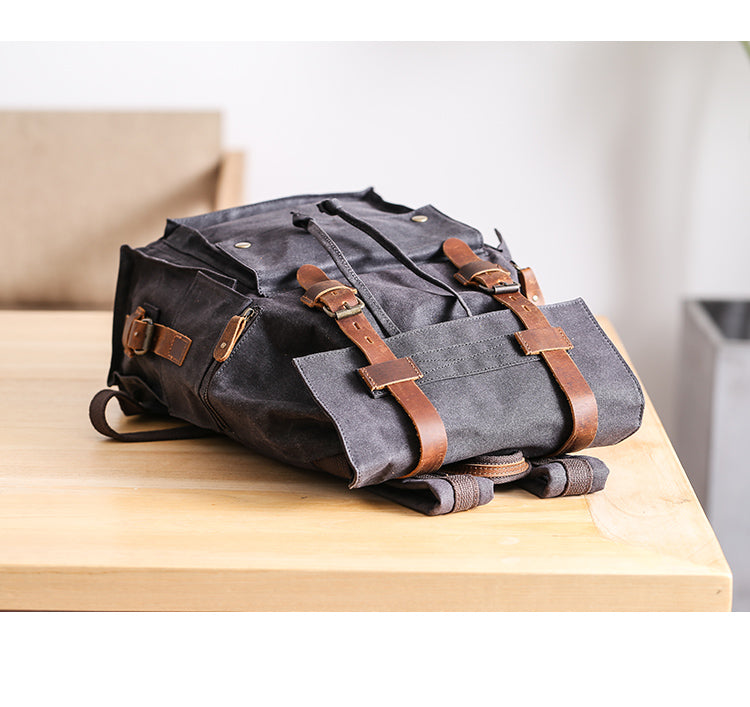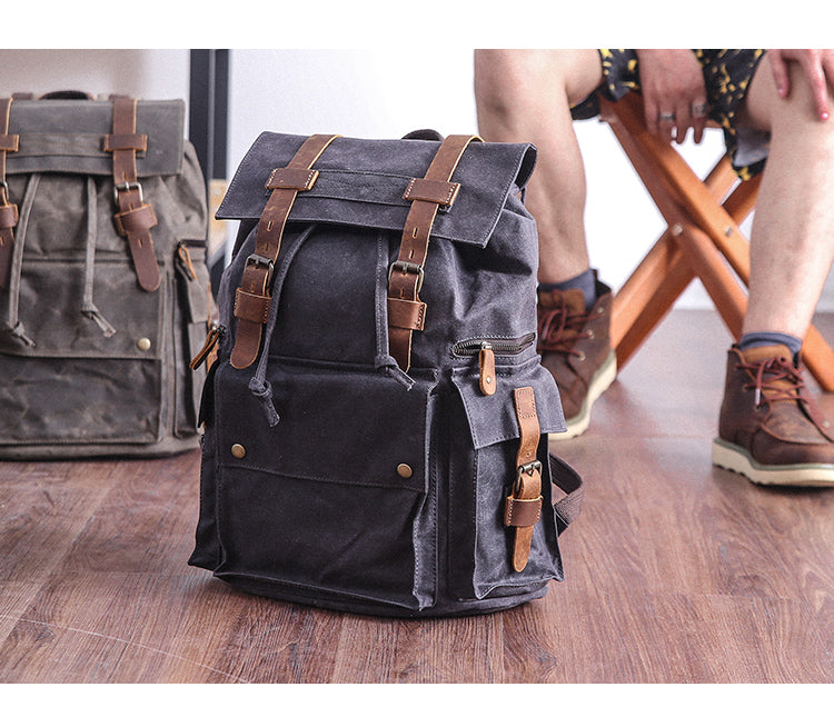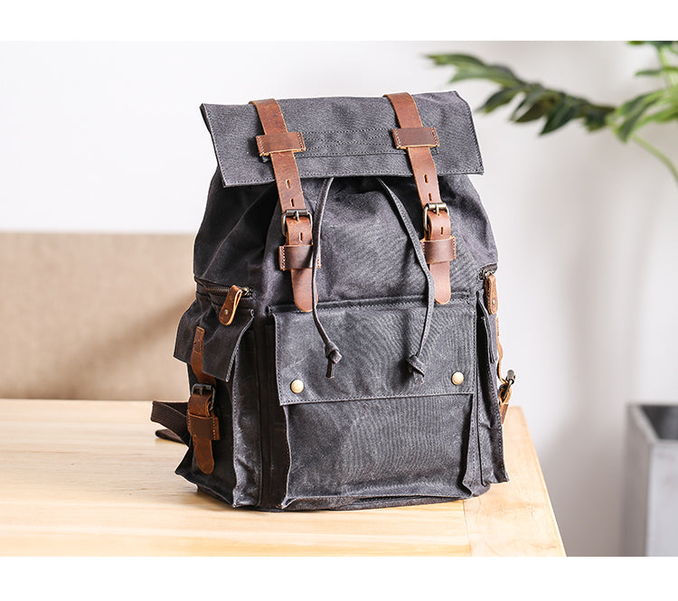 Waxed Canvas Leather Mens Gray Waterproof 15‘’ Large Backpack Travel Backpack College Backpack for Men