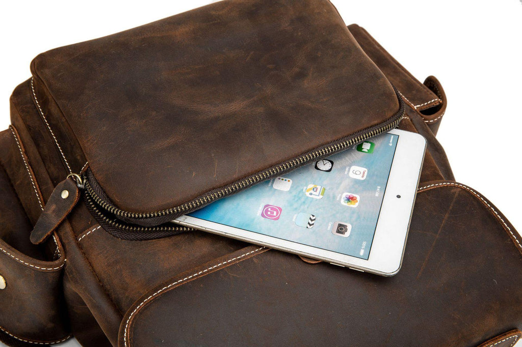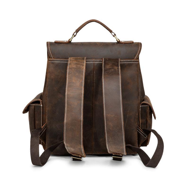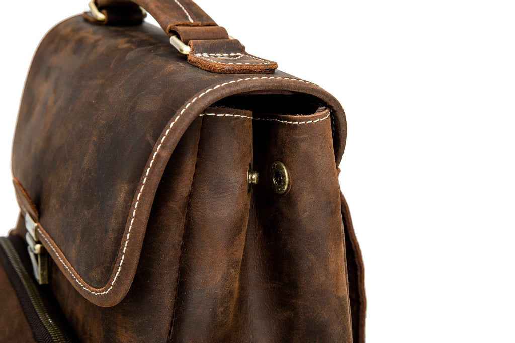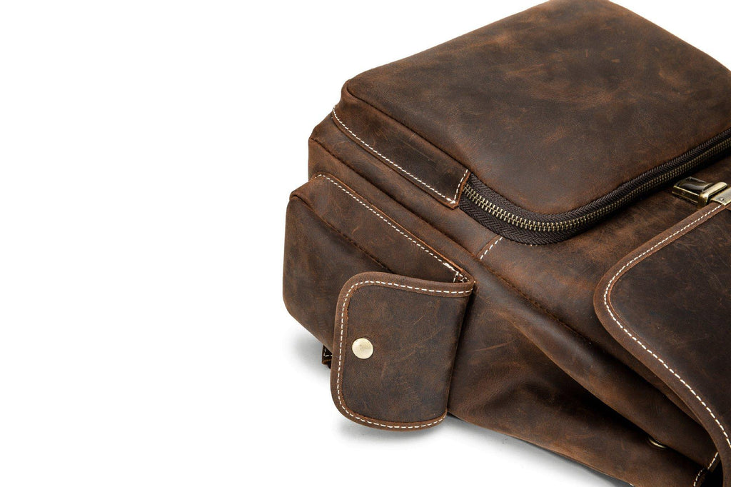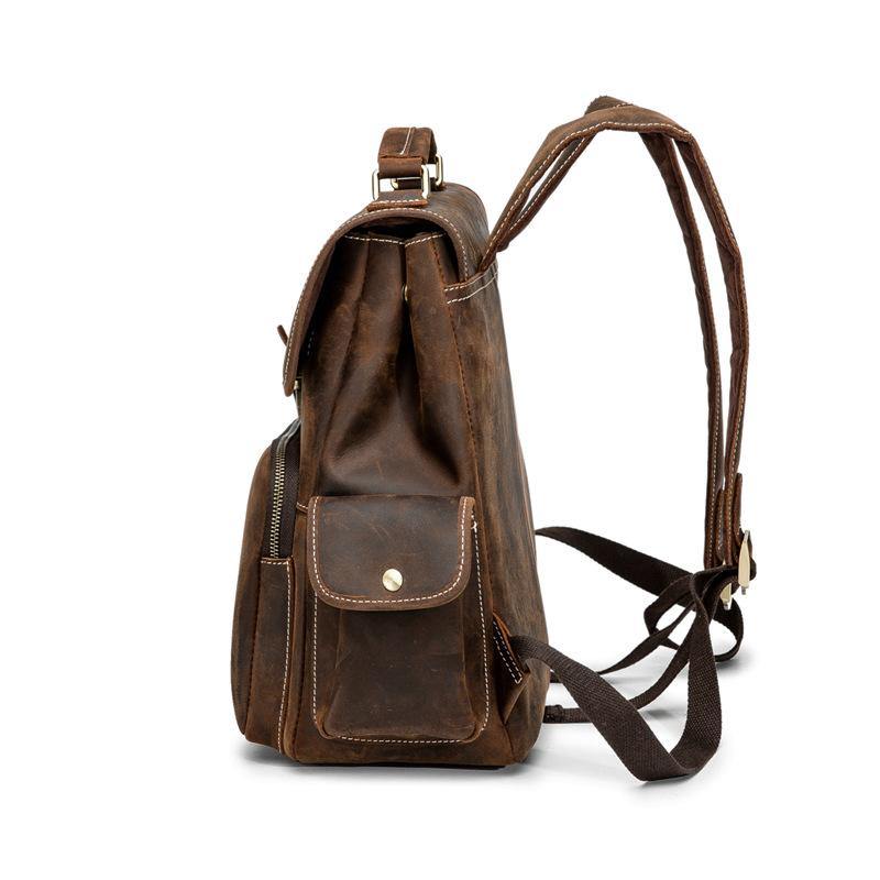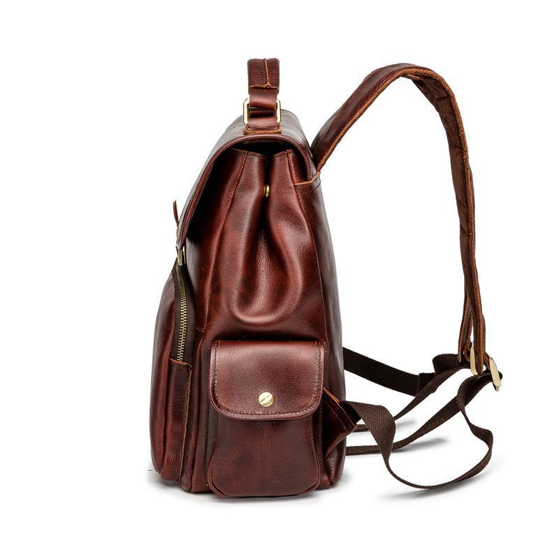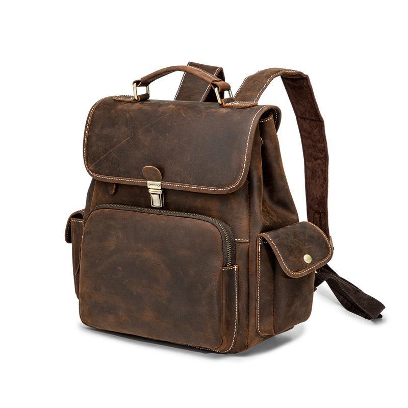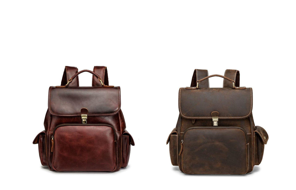 Design: Cool Dark Brown Mens Leather College Backpack Laptop Backpack Red Brown Travel Backpack for MenOverview: