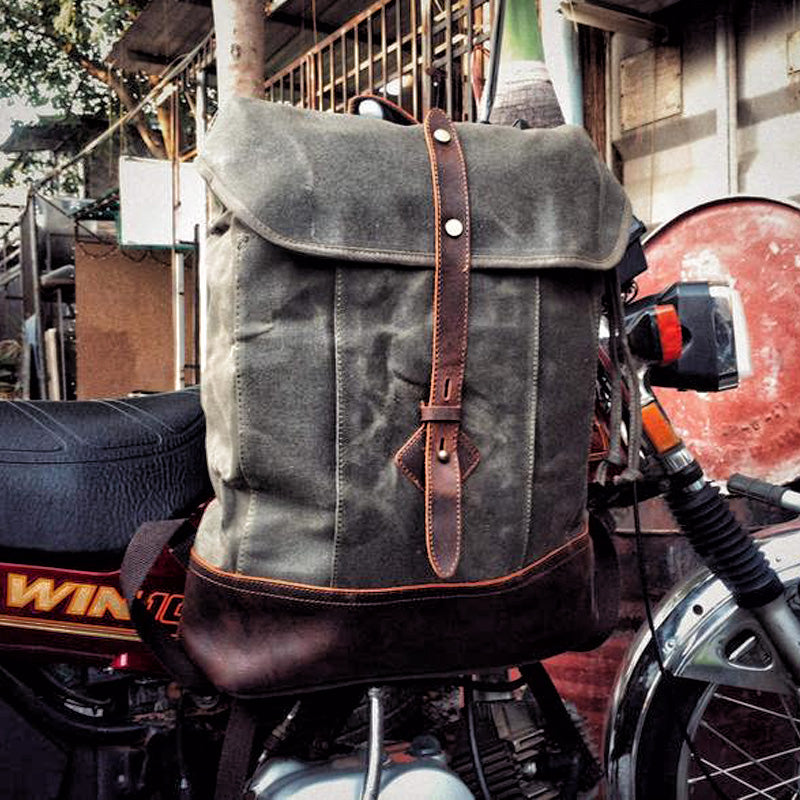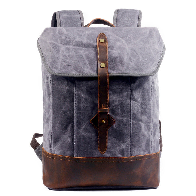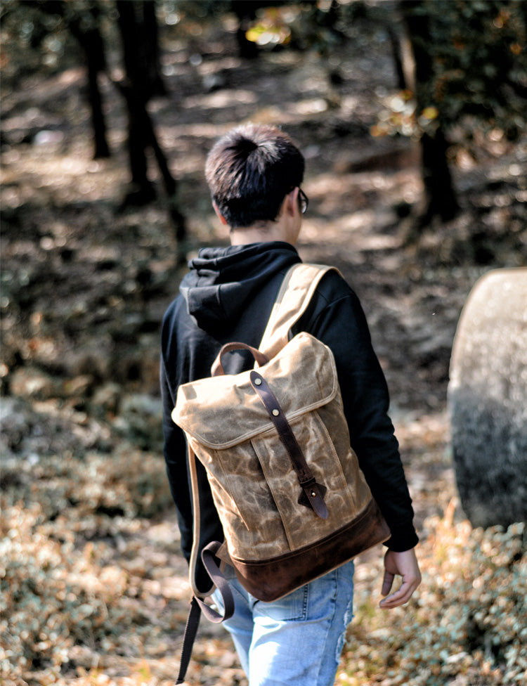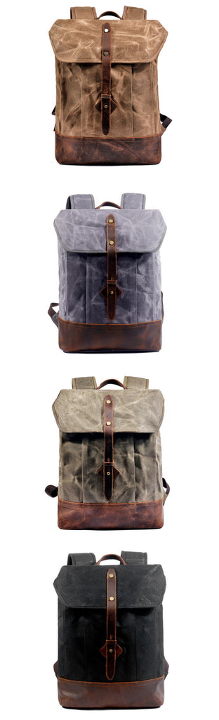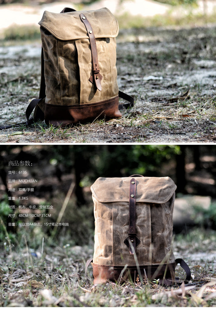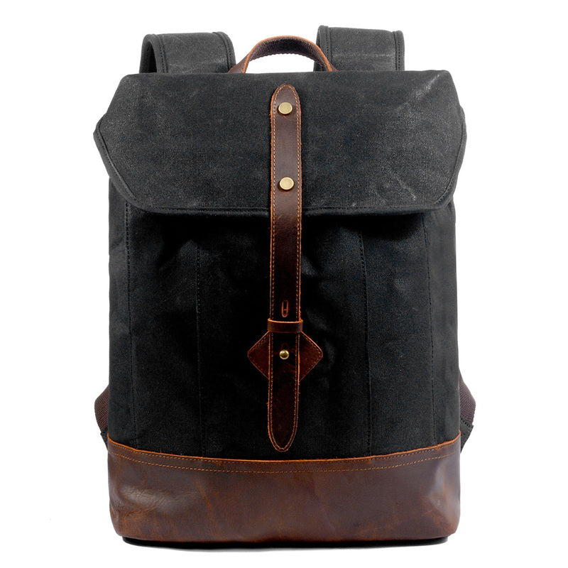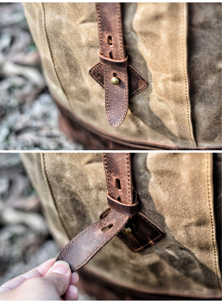 Design: Cool Waxed Canvas Black Leather Waterproof Barrel Backpack Travel Backpack Bucket Hiking Backpack for Men