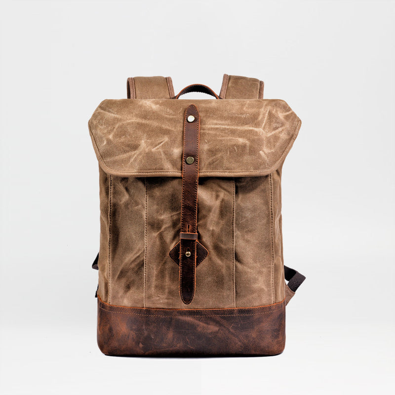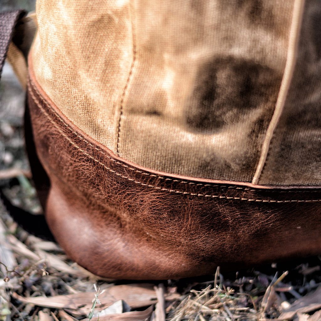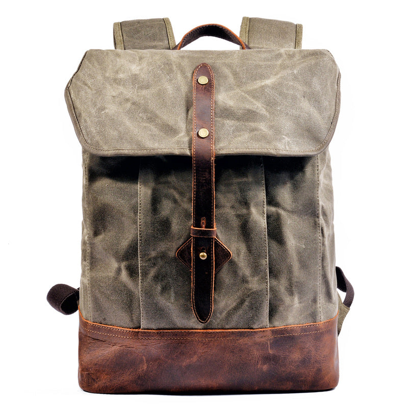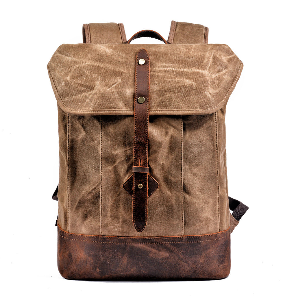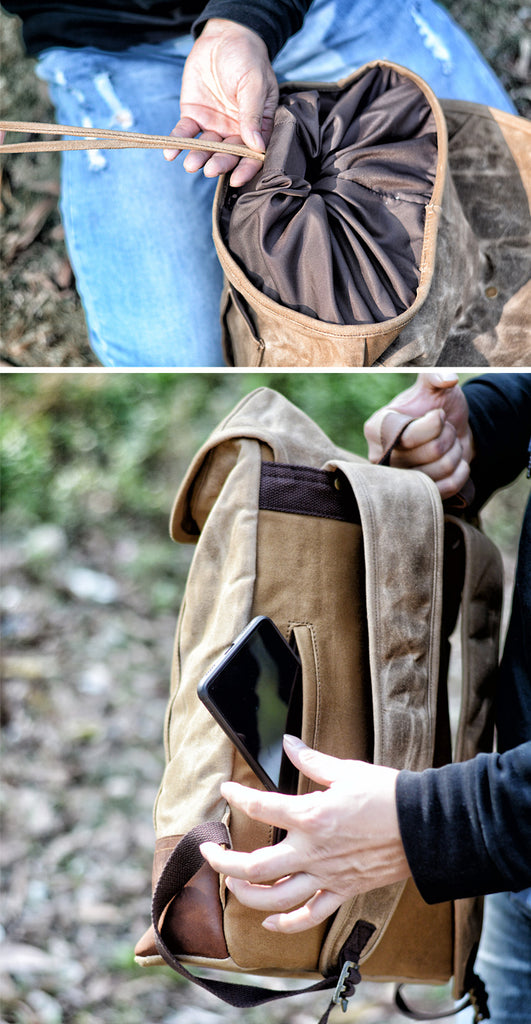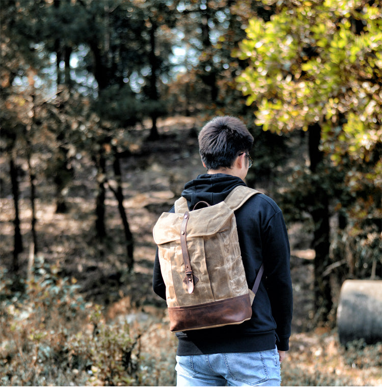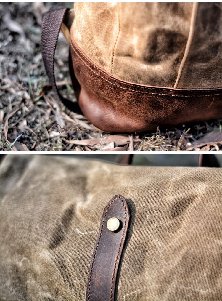 Style: Cool Waxed Canvas Black Leather Waterproof Barrel Backpack Travel Backpack Bucket Hiking Backpack for Men