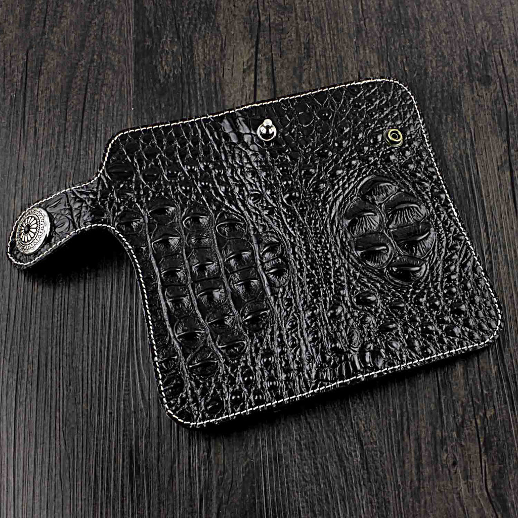 Attached to the wallet is a sturdy silver chain, which not only adds to the rugged biker aesthetic but also serves a practical purpose. The chain connects to a belt loop, ensuring that your wallet stays securely attached to you at all times. This feature is especially useful for bikers or anyone who wants to keep their wallet safe while on the move. The silver chain, with its polished finish, complements the crocodile pattern perfectly, creating a harmonious blend of materials that’s both stylish and functional.