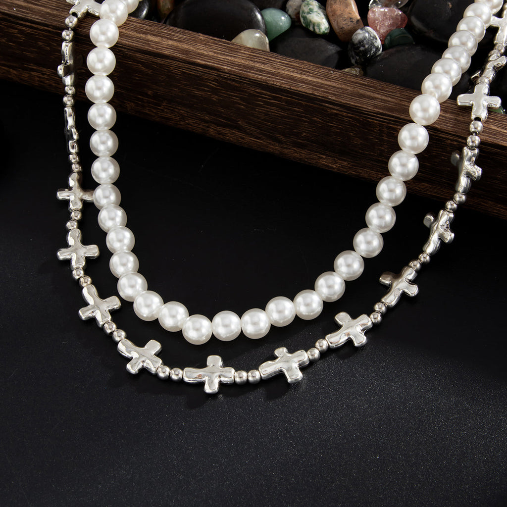 • Material: Alloy crosses/beads with pearl-like enamel finish + iridescent faux pearls