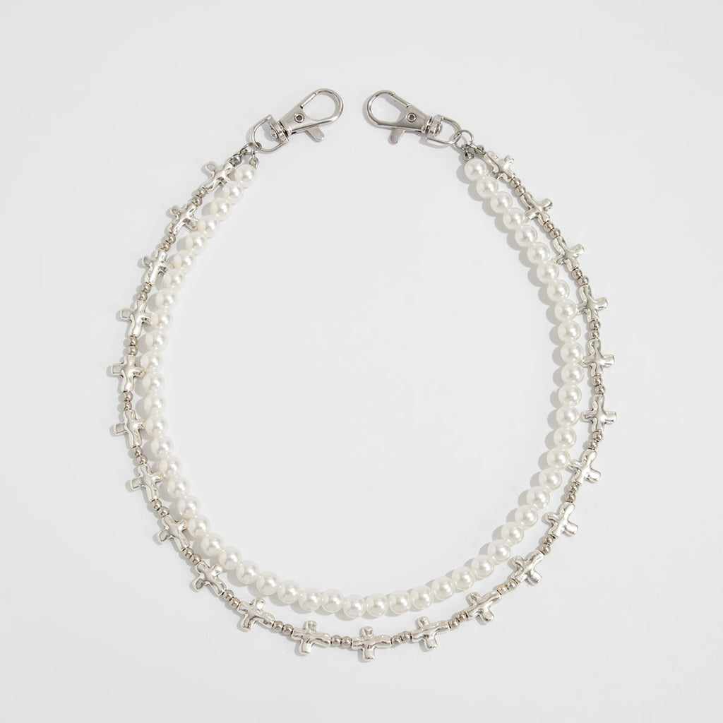 Discover the perfect harmony of edgy symbolism and delicate elegance with our exquisite Pearl Wallet Chain, a beautifully layered accessory designed for the fashion-forward woman. This unique Double Wallet Chain features a striking 52cm outer strand where detailed cross pendants alternate with polished alloy beads, creating a continuous spiritual motif that makes a bold yet refined statement. Paired with a softer 48cm inner strand of lustrous faux pearls, this distinctive Cross Wallet Chain masterfully blends strength and grace, offering a versatile piece that transitions effortlessly from street style to sophisticated casual wear.