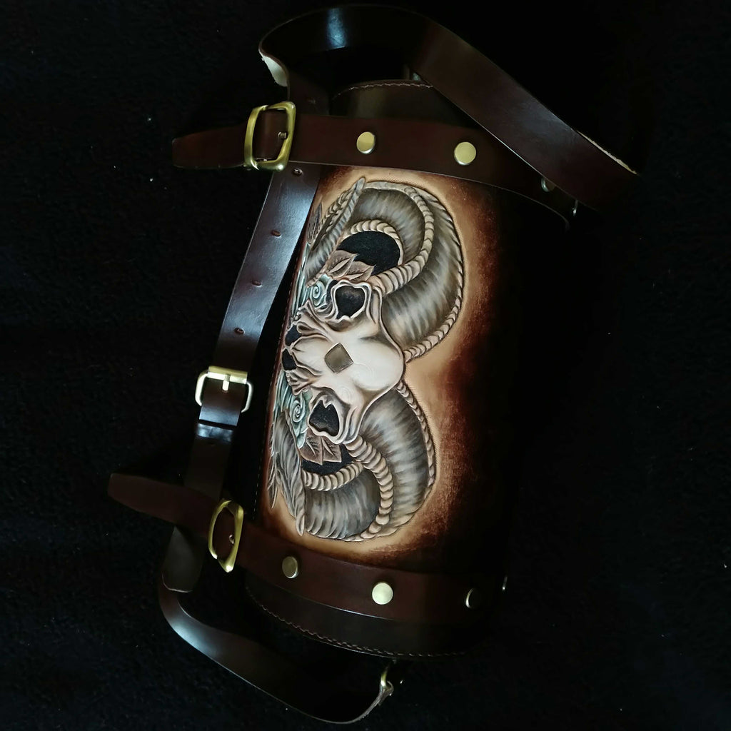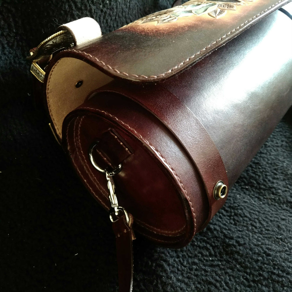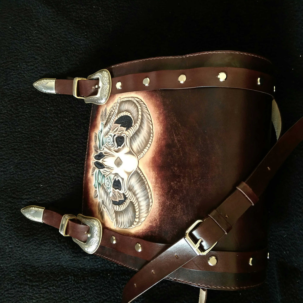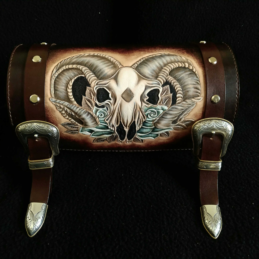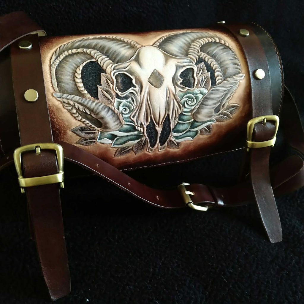 Design: Cool Handmade RAM Skull Tooled Leather Mens Biker Saddle Bag Biker Barrel Side Bag Messenger Bag For Men