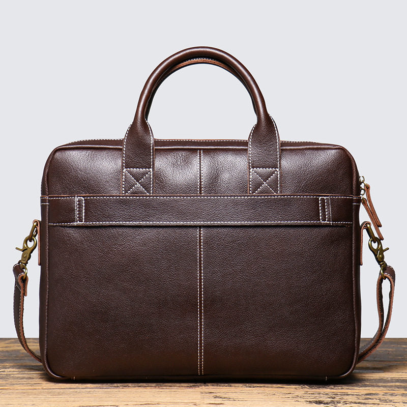 This versatile brown leather laptop briefcase includes a dual-zippered front pocket for quick access to essentials, a spacious main compartment with a padded 14-inch laptop sleeve, a dedicated wallet pocket, and an internal zippered security pocket. The standout feature is the integrated leather trolley strap on the back, allowing the briefcase to be securely attached to the handle of a rolling suitcase for effortless travel. Whether you’re heading to the office, catching a flight, or attending meetings, this briefcase keeps your laptop, documents, tablet, phone, umbrella, and daily essentials neatly organized and protected. Durable, elegant, and intelligently designed, it is more than a briefcase—it’s a reliable companion for the ambitious individual.