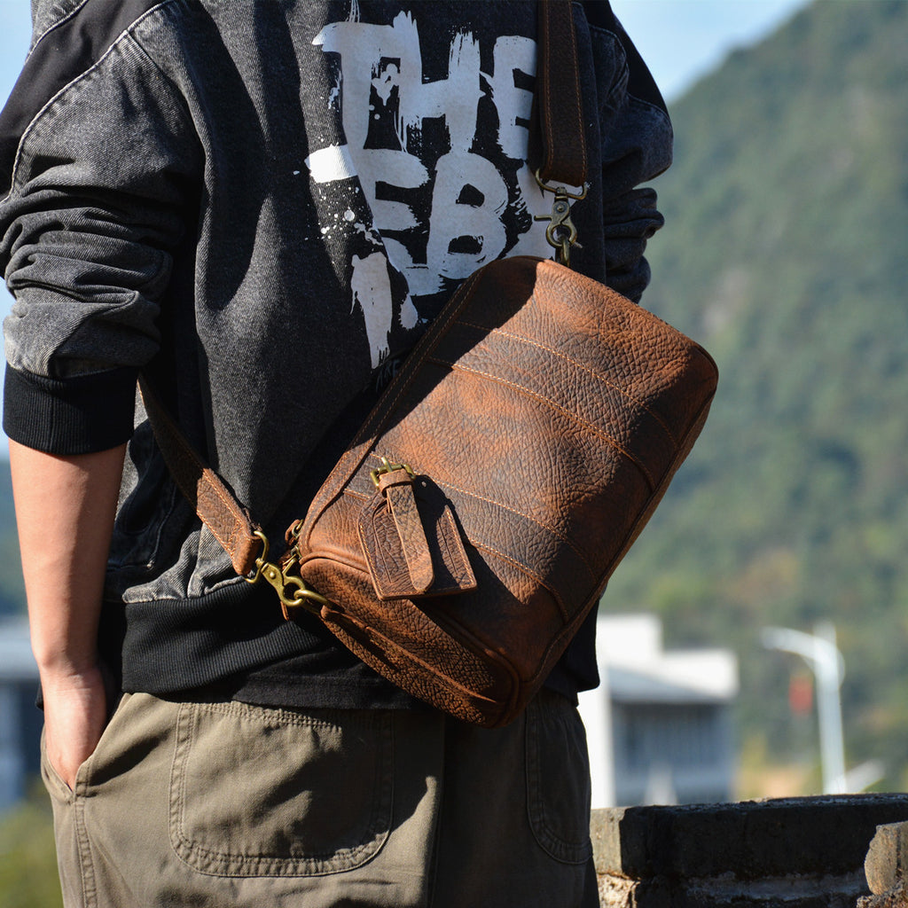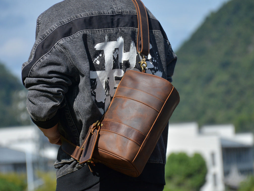 Design: Brown Leather Barrel Crossbody Bag Mens Barrel Leather Bag Small Barrel Shoulder Bag