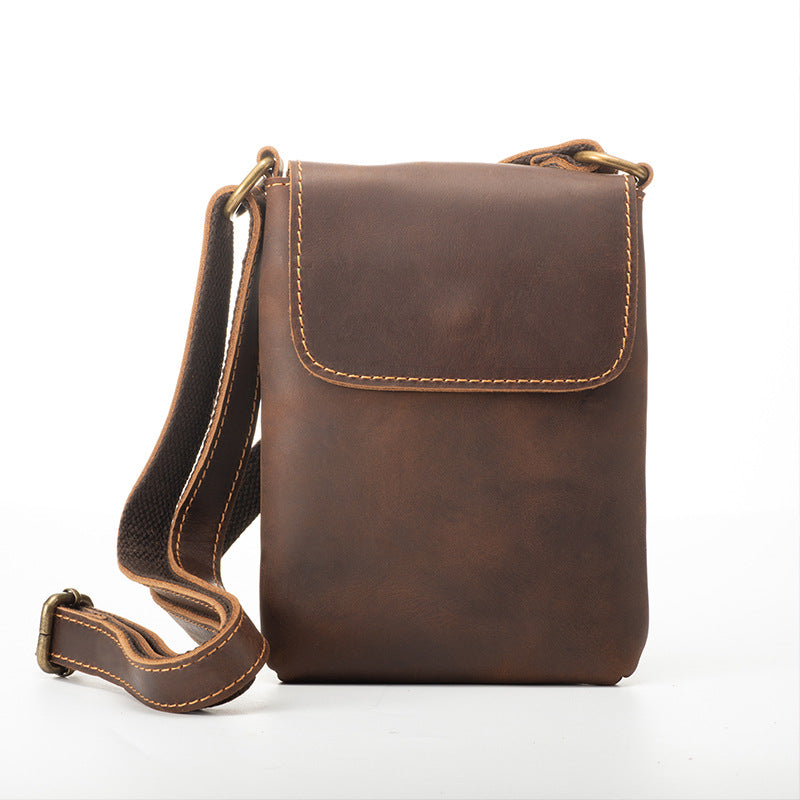 Introducing the Leather Crossbody Phone Purse, a sleek and practical accessory designed to keep your essentials secure, organized, and within easy reach. Crafted from premium full-grain wrinkled leather, this compact Genuine Leather Cell Phone Crossbody Bag measures 18cm x 14cm x 2cm, making it the ideal size for your phone, power bank, cards, and daily must-haves. Available in two classic, masculine shades—Classic Brown and Dark Brown—this durable and stylish bag combines vintage texture with modern functionality, perfect for the man on the move.