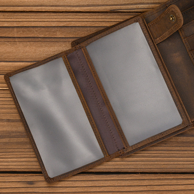 The defining feature of this exceptional wallet with buckle is its authentic leather buckle closure, which ensures your belongings remain securely fastened even when the wallet is fully loaded. The crazy horse leather develops a unique patina over time, enhancing its vintage character and making it a timeless companion for daily use. Whether you’re a fan of retro style or simply appreciate practical design, this leather vertical bifold wallet delivers both style and substance.