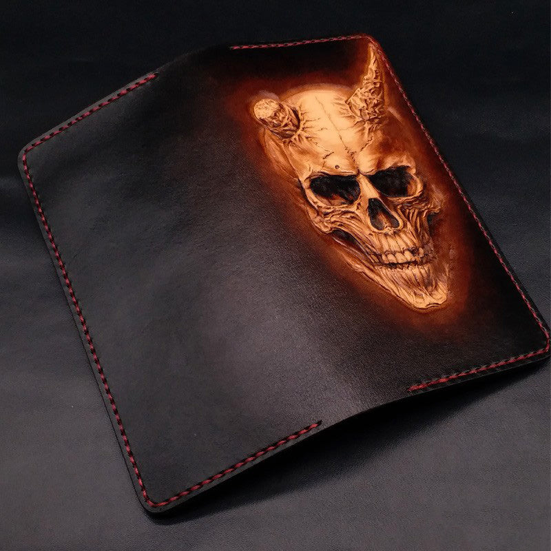 Style: Dark Coffee Handmade Tooled Smiling Skull Leather Mens Bifold Long Wallet Clutch For Men