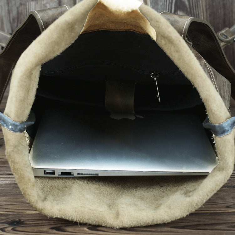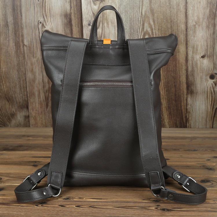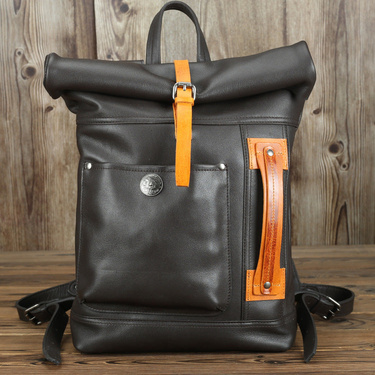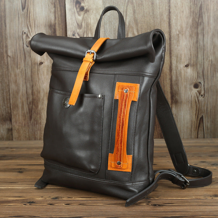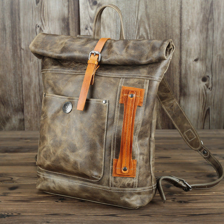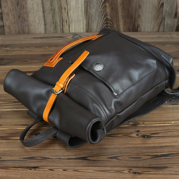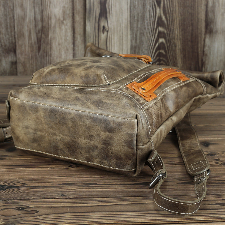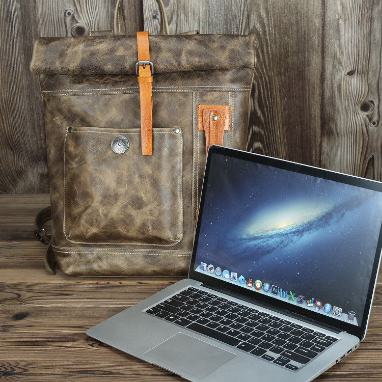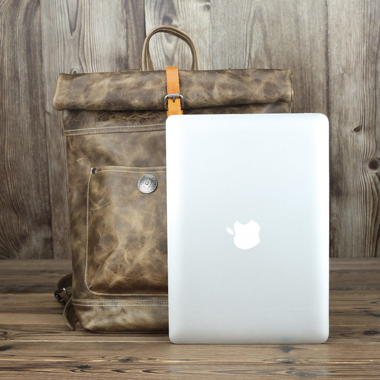 Mens Leather 14 inches Large School Laptop Backpack Rollup Khaki Brown Travel Backpacks for Men