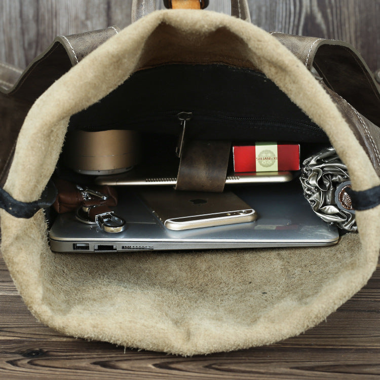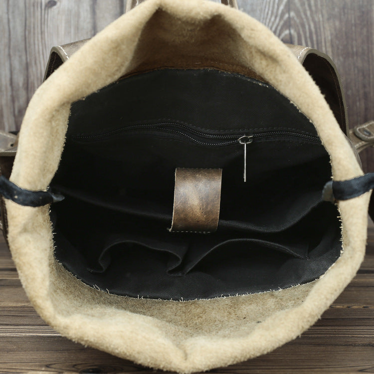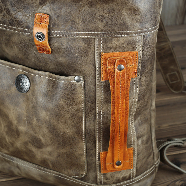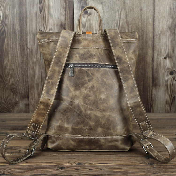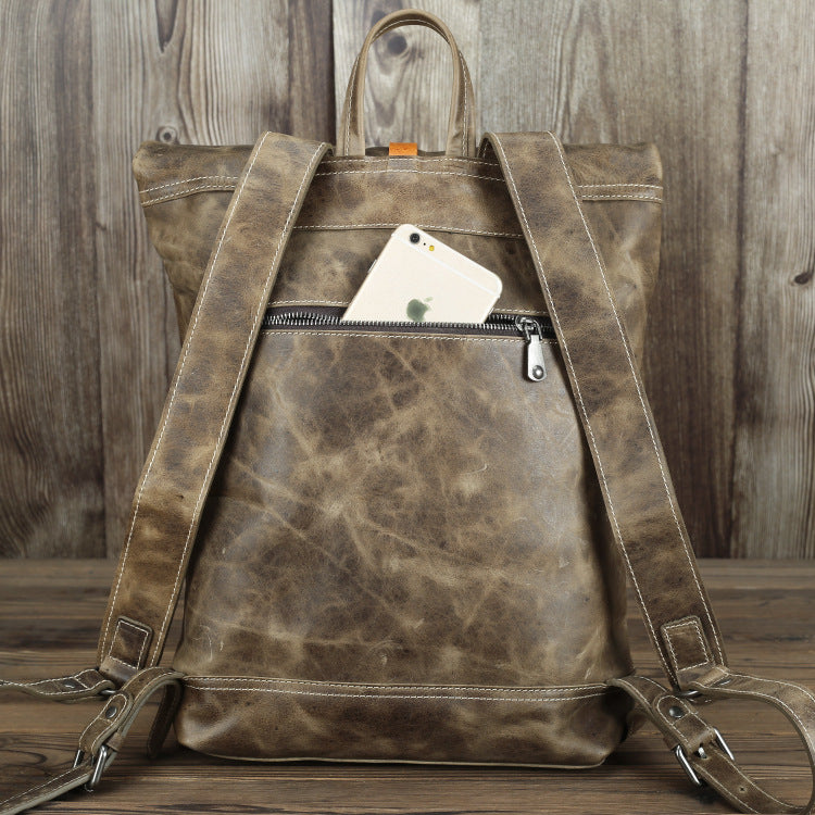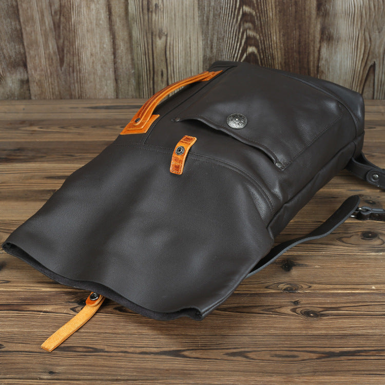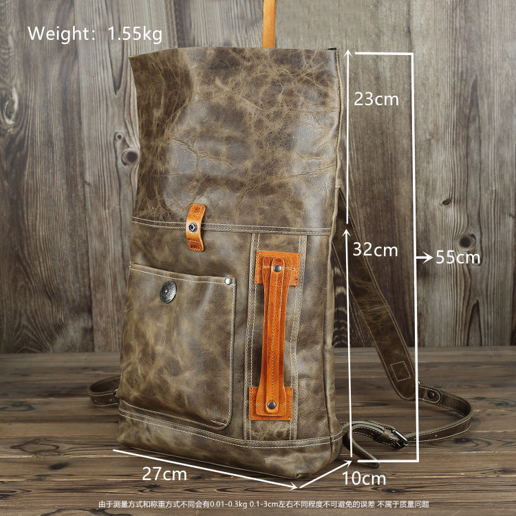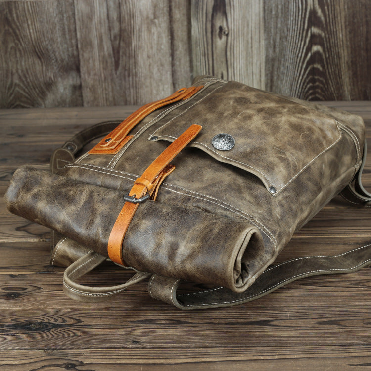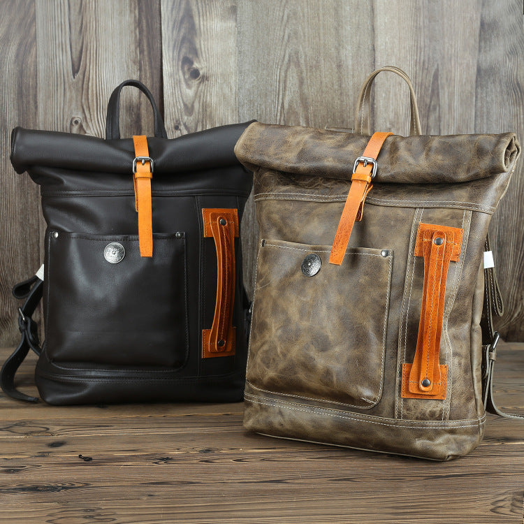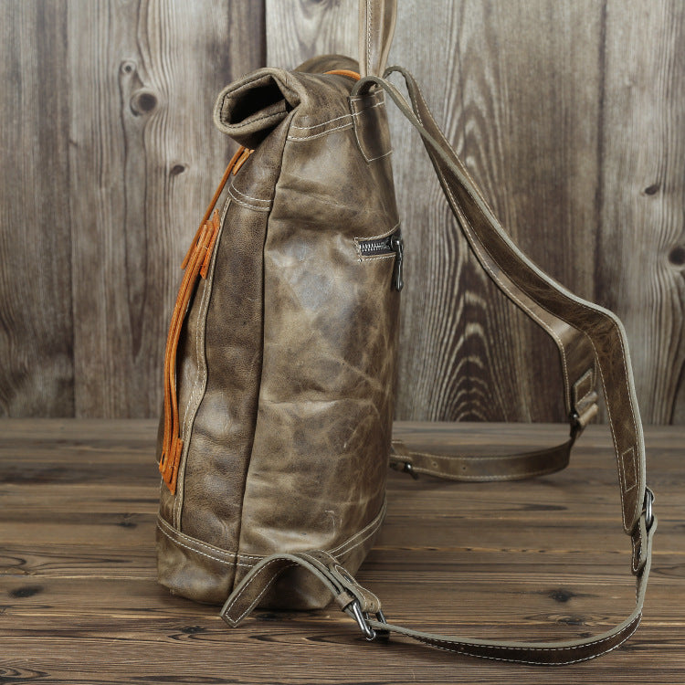 Mens Leather 14 inches Large School Laptop Backpack Rollup Khaki Brown Travel Backpacks for Men