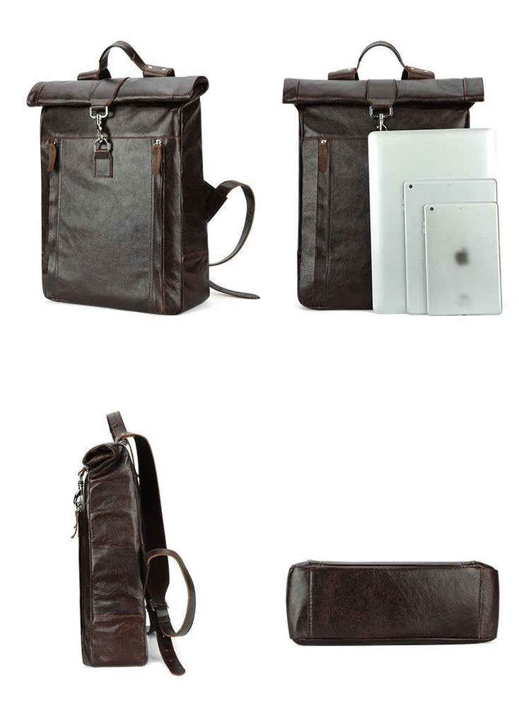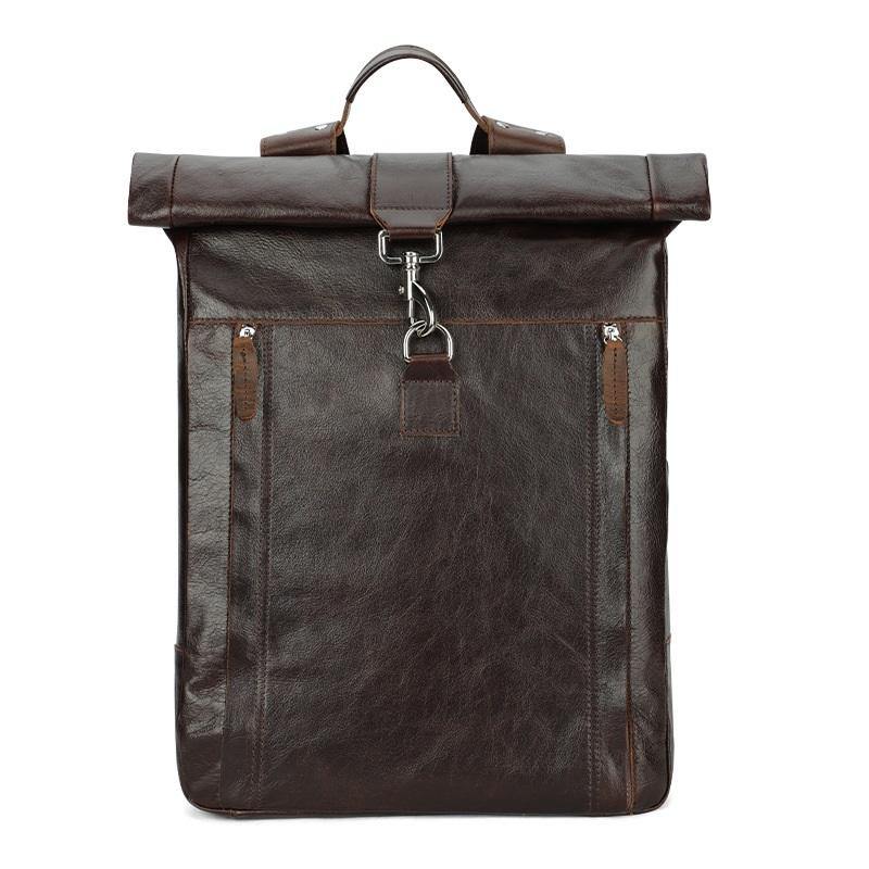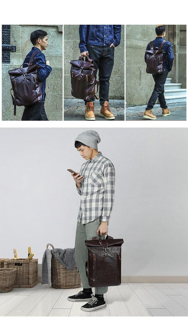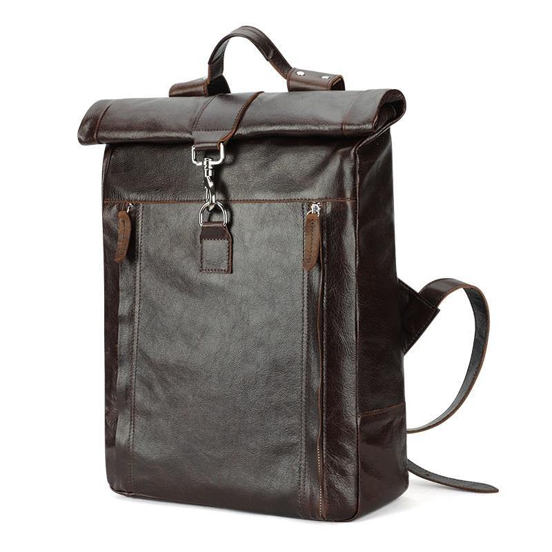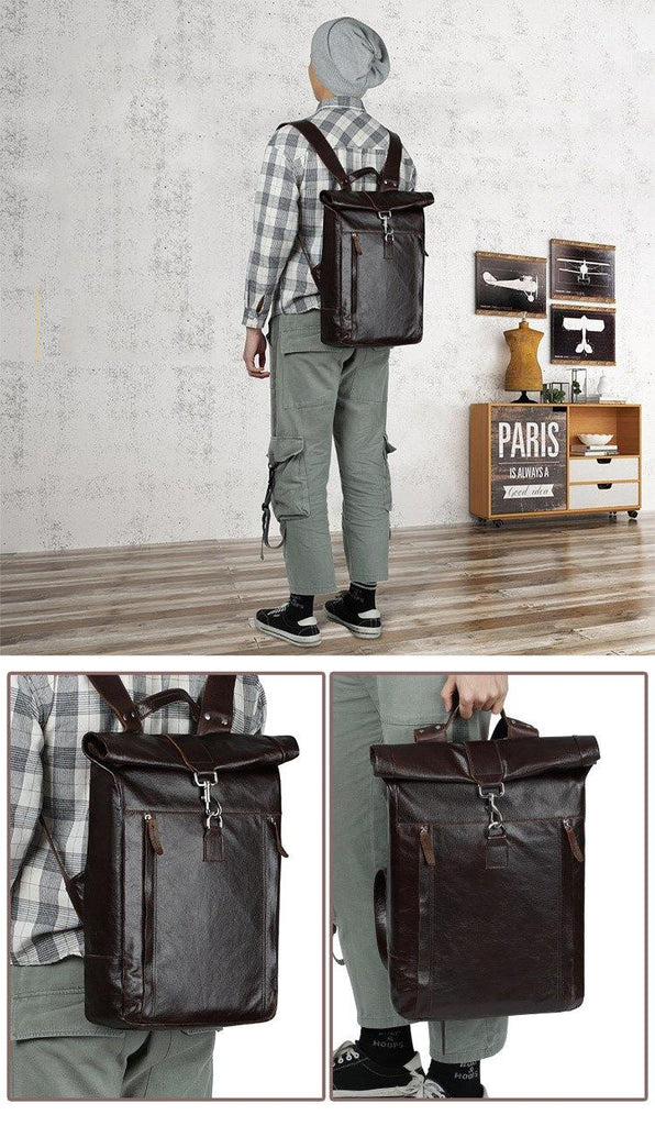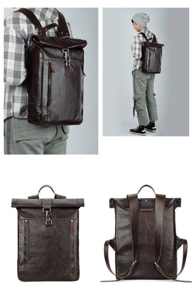 Fashion Coffee Leather Men's 15 inches Rollup Backpack Computer Backpack School Backpack For Men