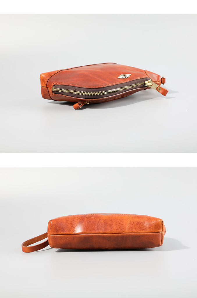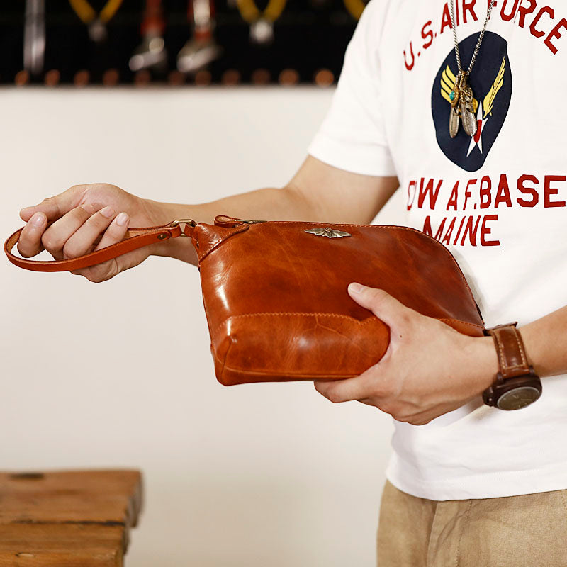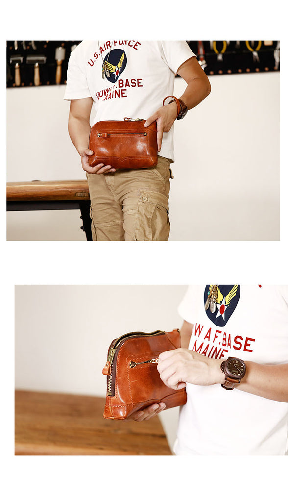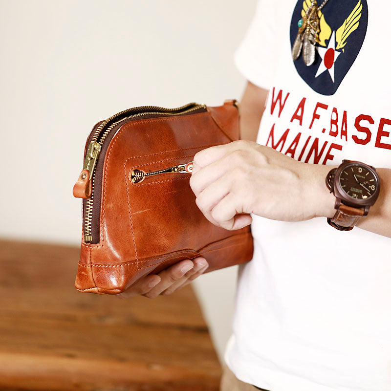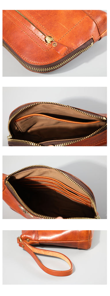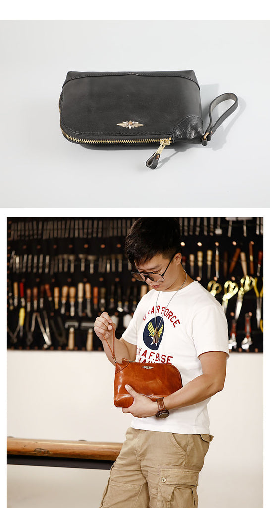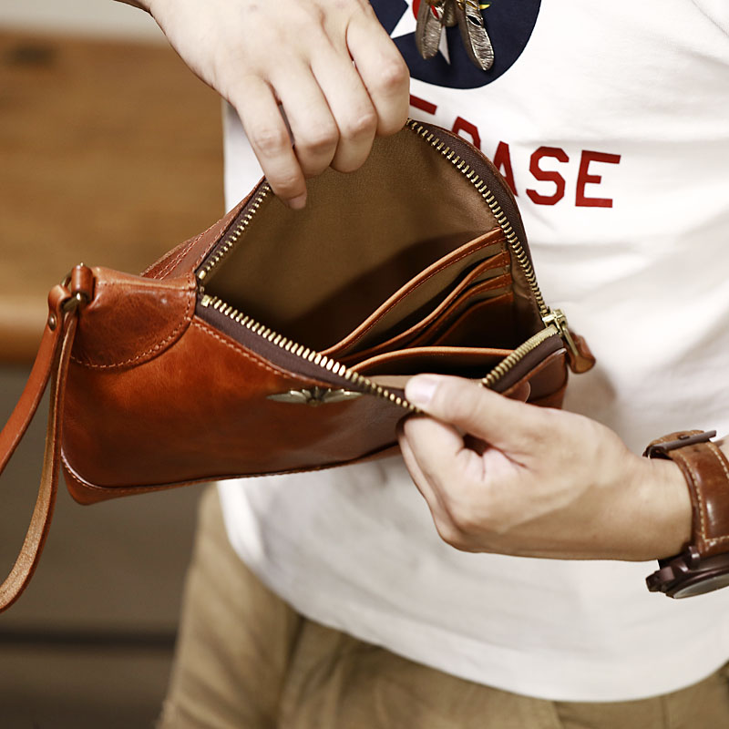 Design: Genuine Leather Hand-stitched Mens 8 inches Clutch Shoulder Bag Zipper Clutch Wristlet Wallet for Men